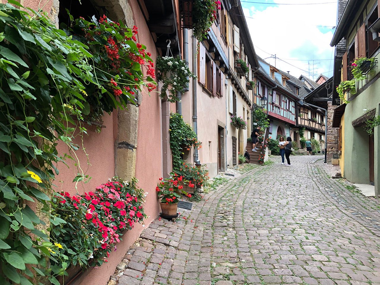 În vale, satul Eguisheim își primește vizitatorii cu brațele deschise și pline de flori. Un tur ghidat ne spune că viticultura ar fi existat în regiune chiar înainte de venirea romanilor.