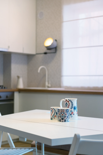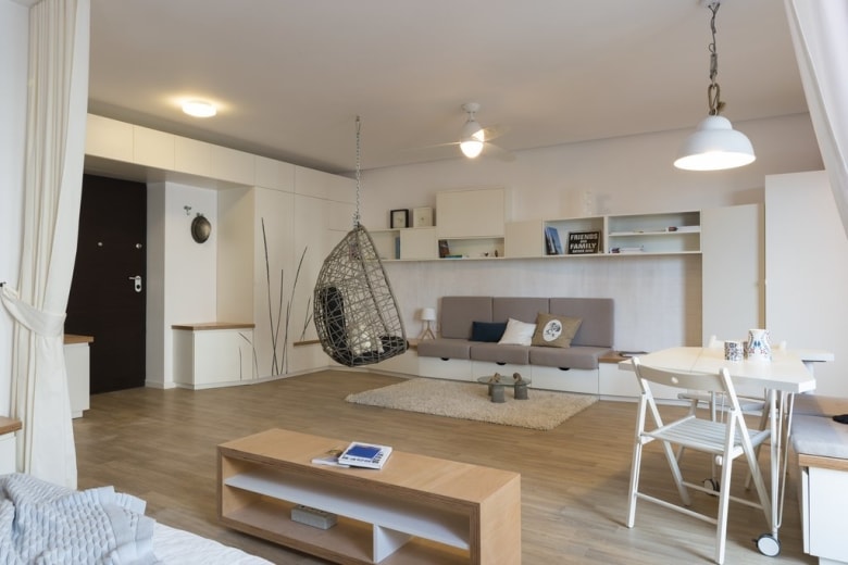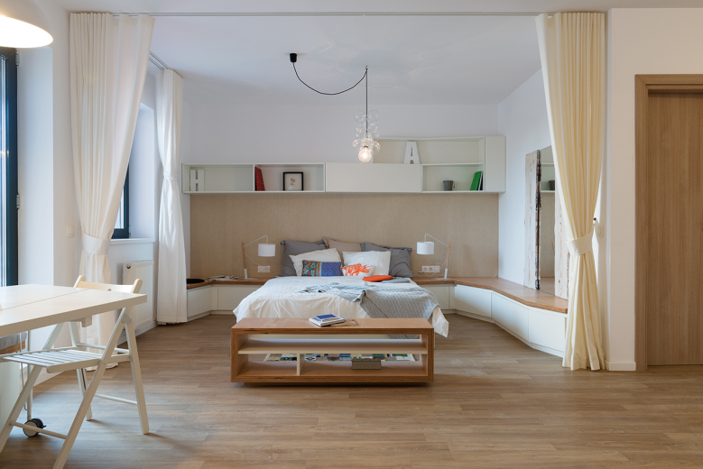 Aceasta din urmă împarte cu livingul o masă rotativă şi rabatabilă custom-made în jurul căreia se poate sta pe o banchetă care înglobează şi radiatorul, completată de două scaune pliante. Întoarsă către bucătărie, masa poate funcţiona ca un blat de lucru în plus care să suplinească dimensiunea redusă a bucătăriei. Trecerea din living spre dormitor este marcată şi de mobilierul TV, acesta din urmă putând fi orientat spre canapea ori spre pat. În dormitor, dimensiunea mobilierului se reduce, banchetele fiind prevăzute cu spaţii de depozitare şi putând avea rol de noptieră sau de loc de stat.