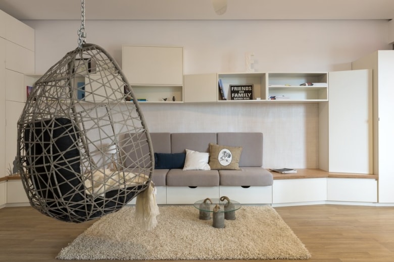 În zona de intrare acesta este mai înalt, pe dulap fiind aplicat un autocolant cu elemente vegetale – fire de iarbă supradimensionate, care trimit la vecinătatea cu Parcul Tineretului. Livingul continuă firul minimalist, aici mobilierul „spărgându-se” în două părţi: biblioteca suspendată şi bancheta din lemn stratificat. Canapeaua este build-in, integrându-se în mobilierul perimetral, dar vedeta livingului rămâne scaunul-leagăn suspendat care înlocuieşte clasicul fotoliu. Măsuţa de cafea prilejuieşte întâlnirea dintre sticlă şi betonul aparent (picioare) pe care îl vom regăsi şi în baie, pe plafonul de deasupra căzii sau în stâlpul dintre living şi bucătărie.