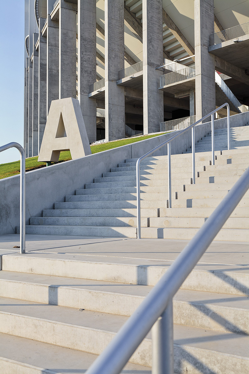 Volumul de șase niveluri al stadionului se încheie vizual la partea superioară prin golul dintre corpul principal opac și copertinele din pânză, păstrând o plăcută proporție orizontală. Degradeul cromatic al tribunelor urmează în mozaic culorile naționale, albastrul fiind amplasat la partea superioară, acolo unde tribunele se confundă cu cerul.