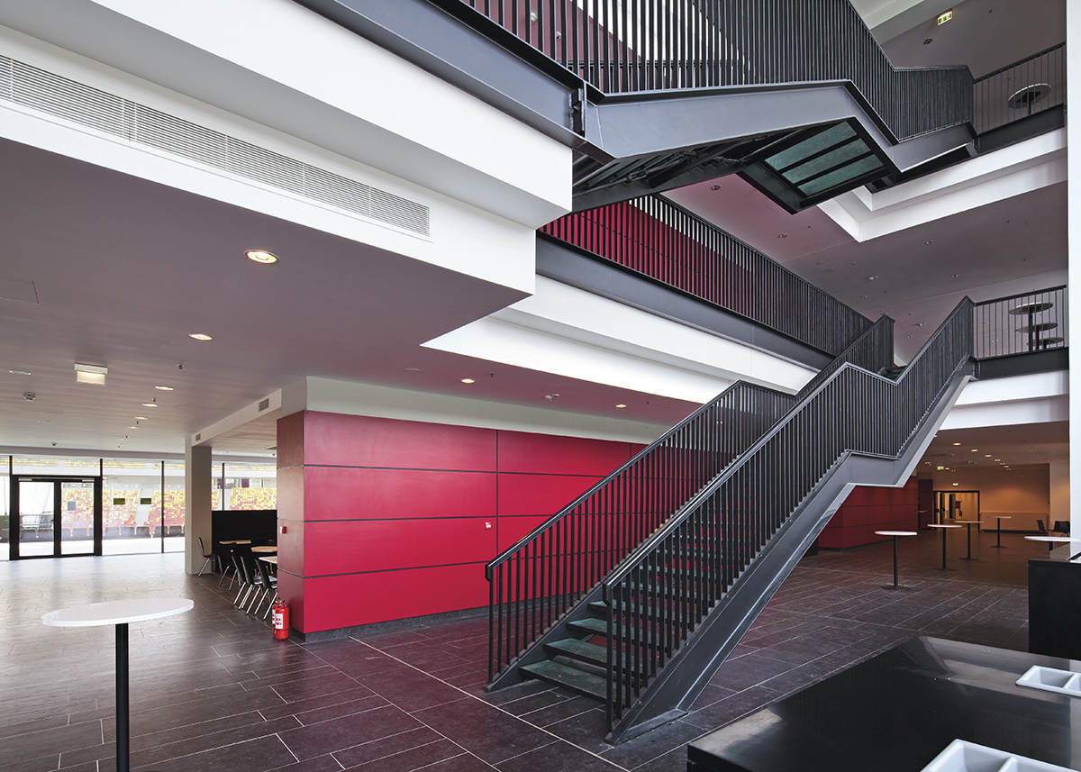 Odată cu trecerea spre spațiile destinate oficialilor, presei și jucătorilor, gama de finisaje se diversifică și înglobează din ce în ce mai multe materiale contemporane – mobilier din plăci compozite și sticlă, parapeți și pardoseli vitrate, ascensoare panoramice, elemente din oțel vopsit negru.