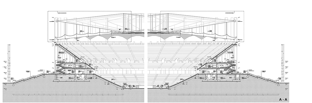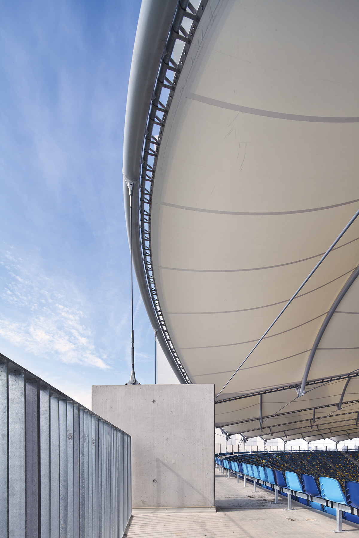 Elementul definitoriu al volumului sunt pânzele elegant curbate care protejează tribunele. Văzute din interiorul arenei, acestea levitează deasupra unei fâșii late de cer, iar din exterior, linia vibrată a cornișei este vizibilă de la orice distanță.