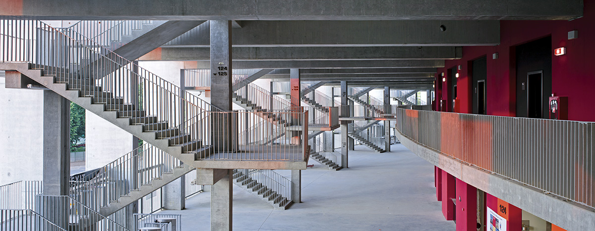 Ritmul stâlpilor înalți, filiformi, din beton precomprimat este de trei ori mai des decât în proiectul inițial, contribuind la dematerializarea structurii. La partea superioară, stâlpii sunt solidarizați prin grinzi subțiri și zvelte de culoare albă, care păstrează transparența.