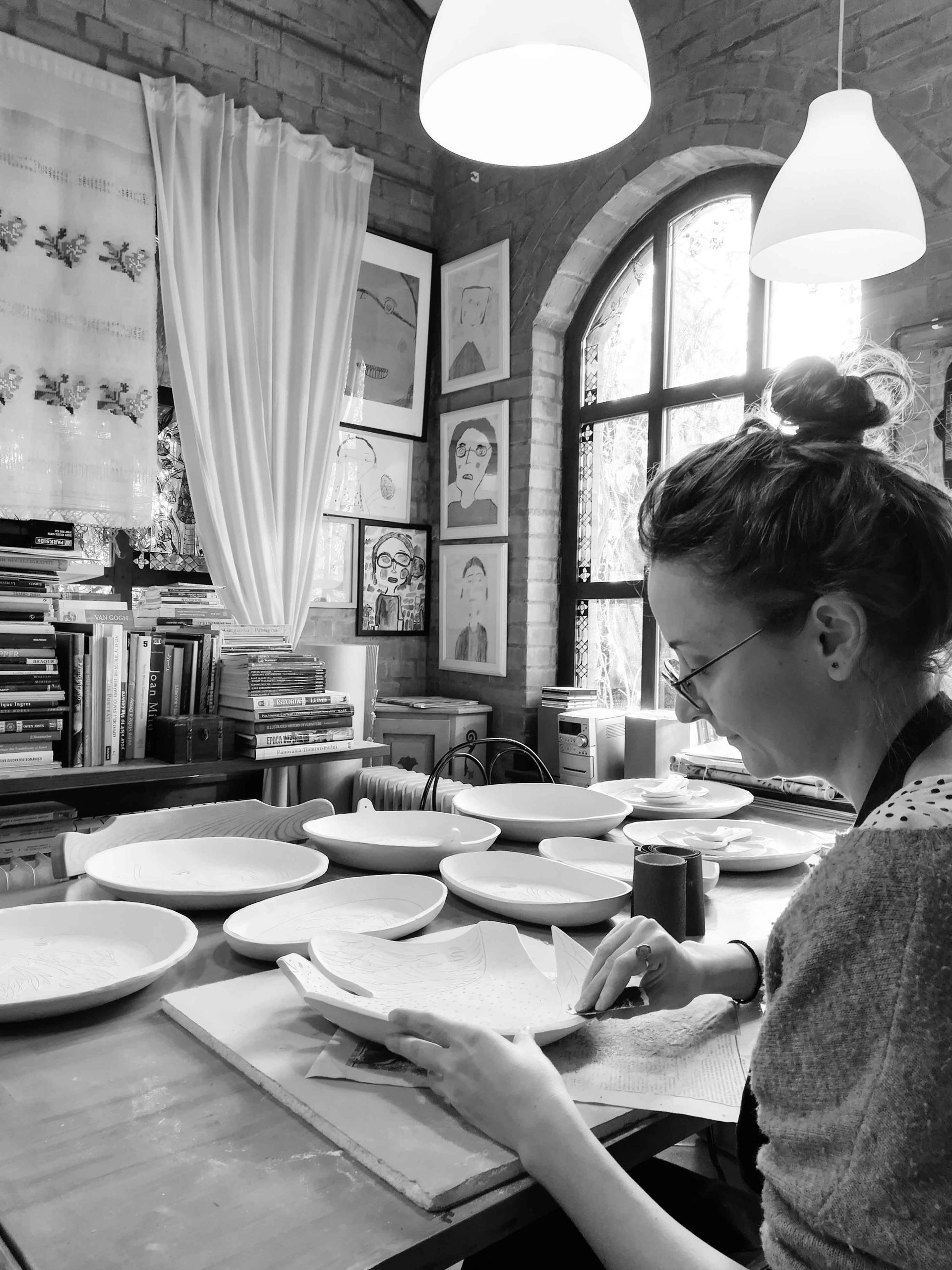 Prefer întotdeauna solitudinea atunci când lucrez – îmi plac acele momente de liniște, de concentrare pe procesul de creație al fiecărui obiect în parte. Acord foarte multă atenție decorului și dacă e nevoie lucrez mult la un obiect, în special la compoziții mai elaborate. În general mă documentez când am subiecte complexe ca să înțeleg mai bine formele, însă majoritatea subiectelor le pictez spontan, pe baza inspirației de moment – încep mereu de la o linie pe care o dezvolt liber. Da, este un proces migălos, există multă repetitivitate atât la modelaj, cât și la pictură și e nevoie de răbdare, căci chiar și atunci când crezi că ai făcut totul așa cum trebuie, se poate întâmpla ceva greșit tocmai la final (probleme de glazurare, fisuri la arderea finală etc.) și toată munca poate fi în zadar.