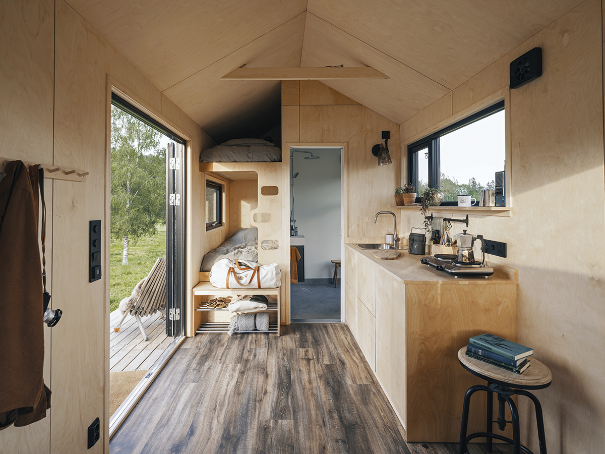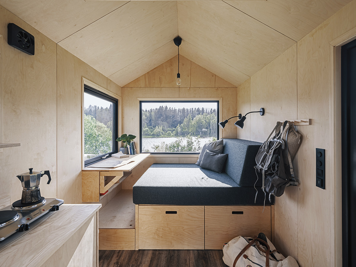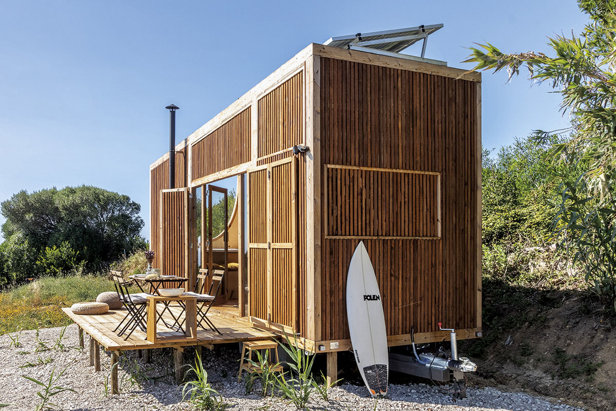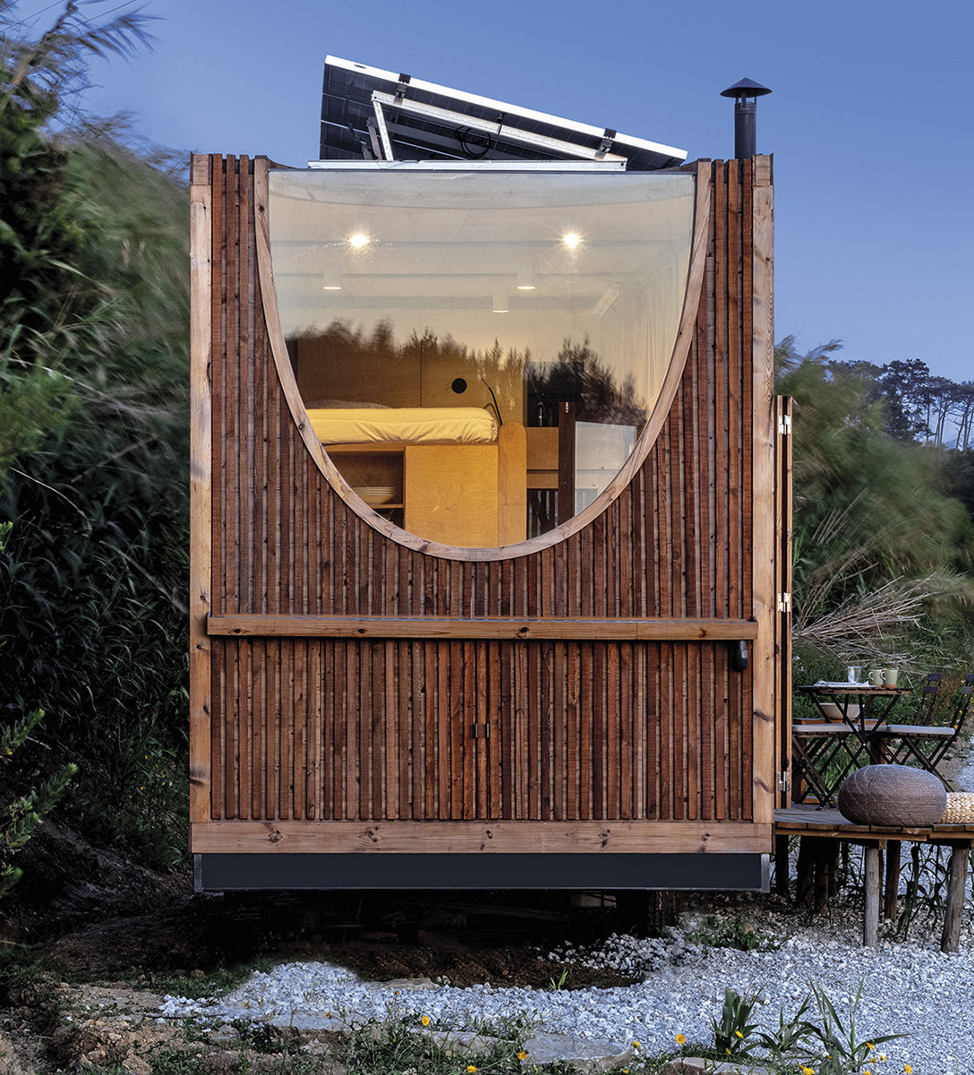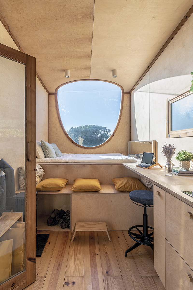 Proiectarea acoperișului cu o înclinare de 5% permite apei pluviale să se scurgă într-un jgheab și de acolo, trecând printr-un sistem de filtrare să ajungă în două rezervoare cu o capacitate de 650 de litri. Apoi, grație tehnologiei, apa este reutilizată în bucătărie și baie. Și pentru că orice tip de energie și materie poate fi transformată și reutilizată, „toaleta uscată este conectată la electricitate (12 V) pentru a genera compost”. Una dintre provocările proiectului a fost, după cum povestesc arhitecții, estetica ferestrei ovale: „pentru care am dezvoltat niște fitinguri folosind o mașină de tăiat CNC și inspirându-ne din sistemul de legătură a șinelor de tren din lemn cu care ne jucam în copilărie”. Un spirit de grație, copilăria, de care ne putem, iată, reapropia ludic, dar și mai atenți și mai responsabili pentru tot ceea ce ne înconjoară.