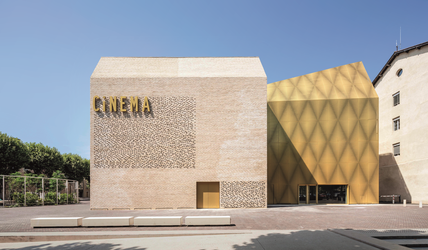 Tradiționalul este însă utilizat într-un mod surprinzător – „clădirea a fost gândită ca un volum virtual fără ferestre, îmbrăcat în cărămidă, inclusiv acoperișul”.Surprinzătoare este și rezolvarea necesității de a face loc celor 7 săli programate ale cinematografului: pentru a nu pierde simetria obținută prin imitarea clădirilor înconjurătoare, a apărut un al doilea volum, o „falsă” extindere. Noua clădire se impune ludic prin dualitatea ostentativ-ascuns – silueta sa acoperită în metal auriu se camuflează discret în spatele volumului principal. Un frumos joc al volumetriilor și materialelor care permit luminii să încălzească strălucitor corpuri – iată cum un cinematograf își poate aștepta spectatorii contemporani.