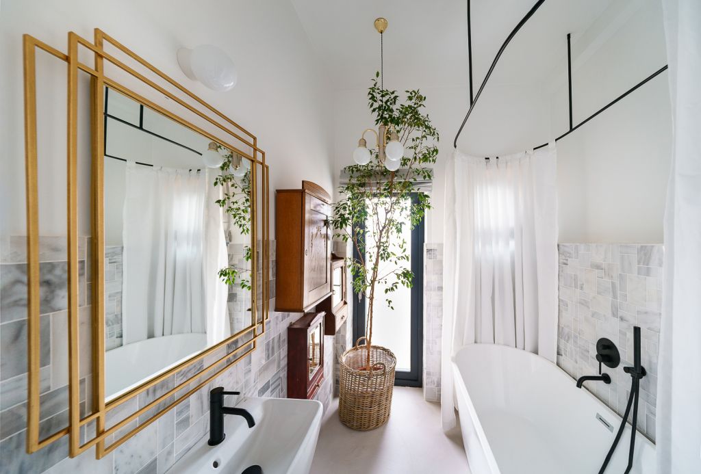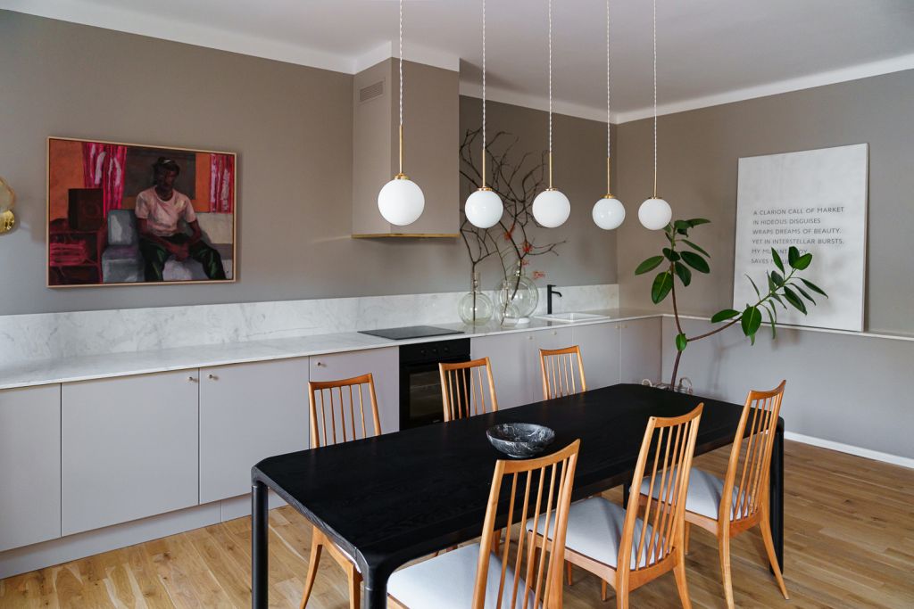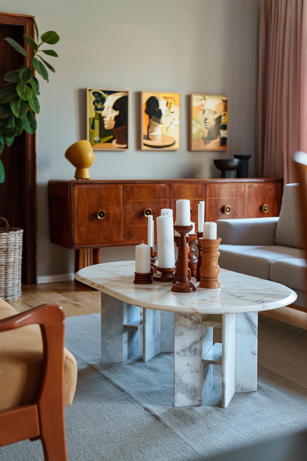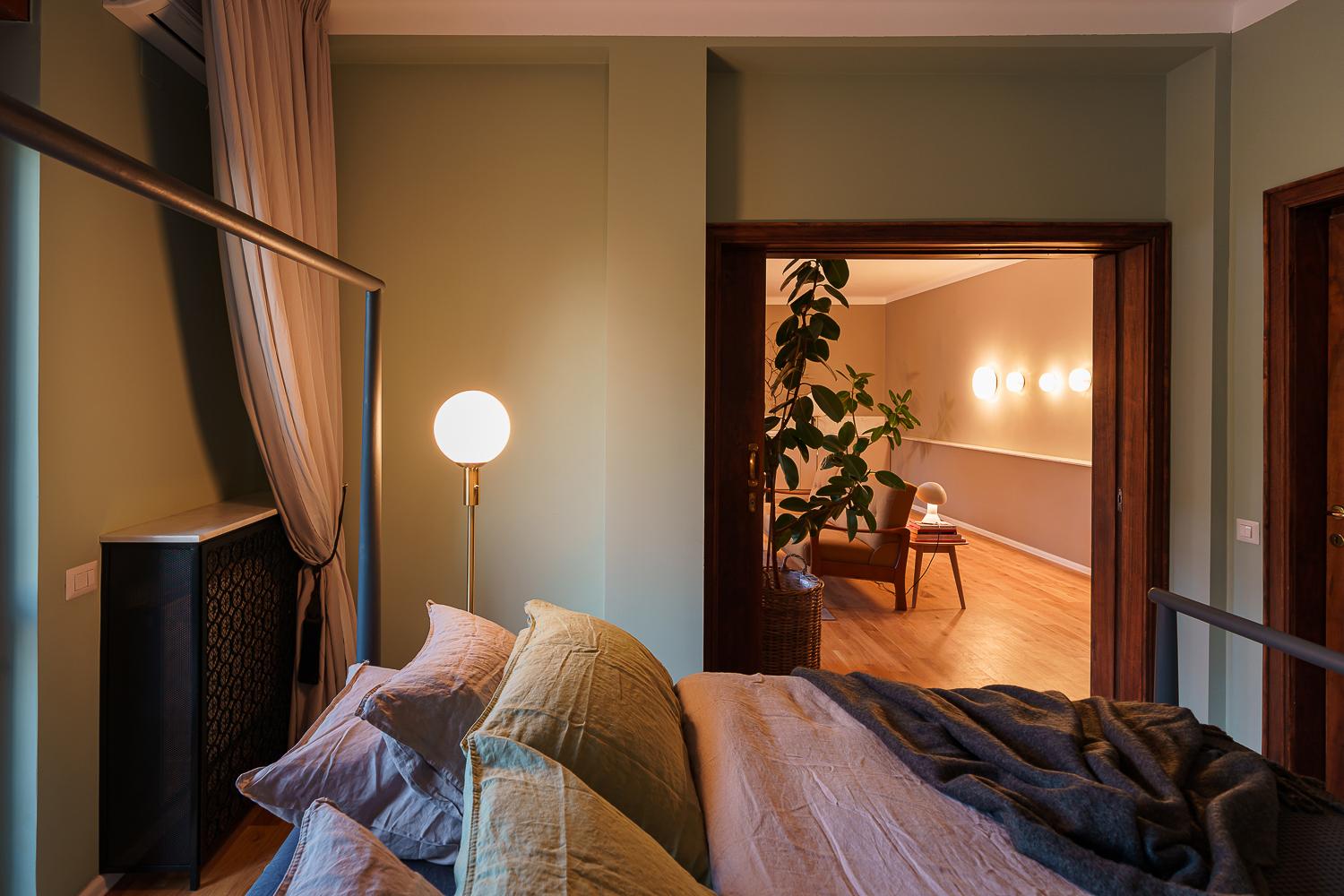 Materialele nobile, mobilierul antichizat și operele de artă prezente în fiecare cameră creează o atmosferă de apartament aparținând unui colecționar din perioada interbelică, dar spațiul este plasat ferm în prezent prin detalii subtile precum rama metalică a patului dormitorul ce ocupă fosta bucătărie sau bateriile negru mat din baia principală.