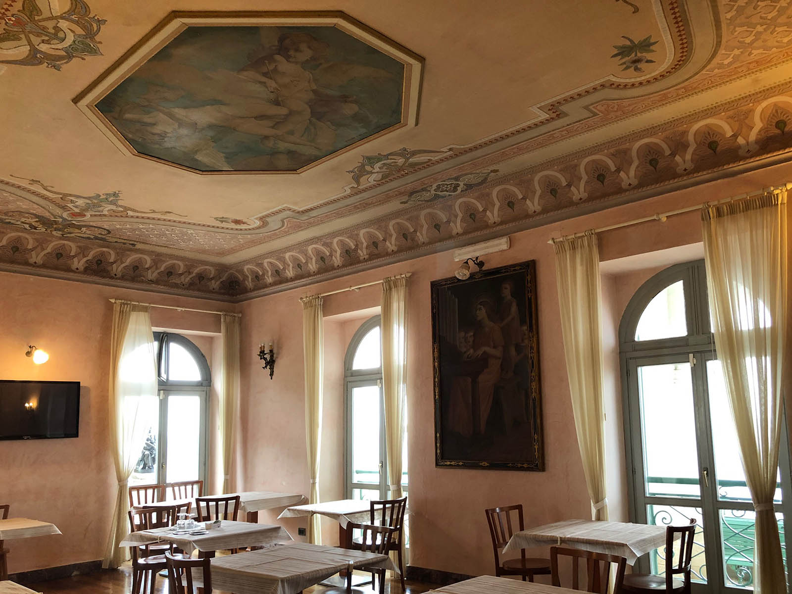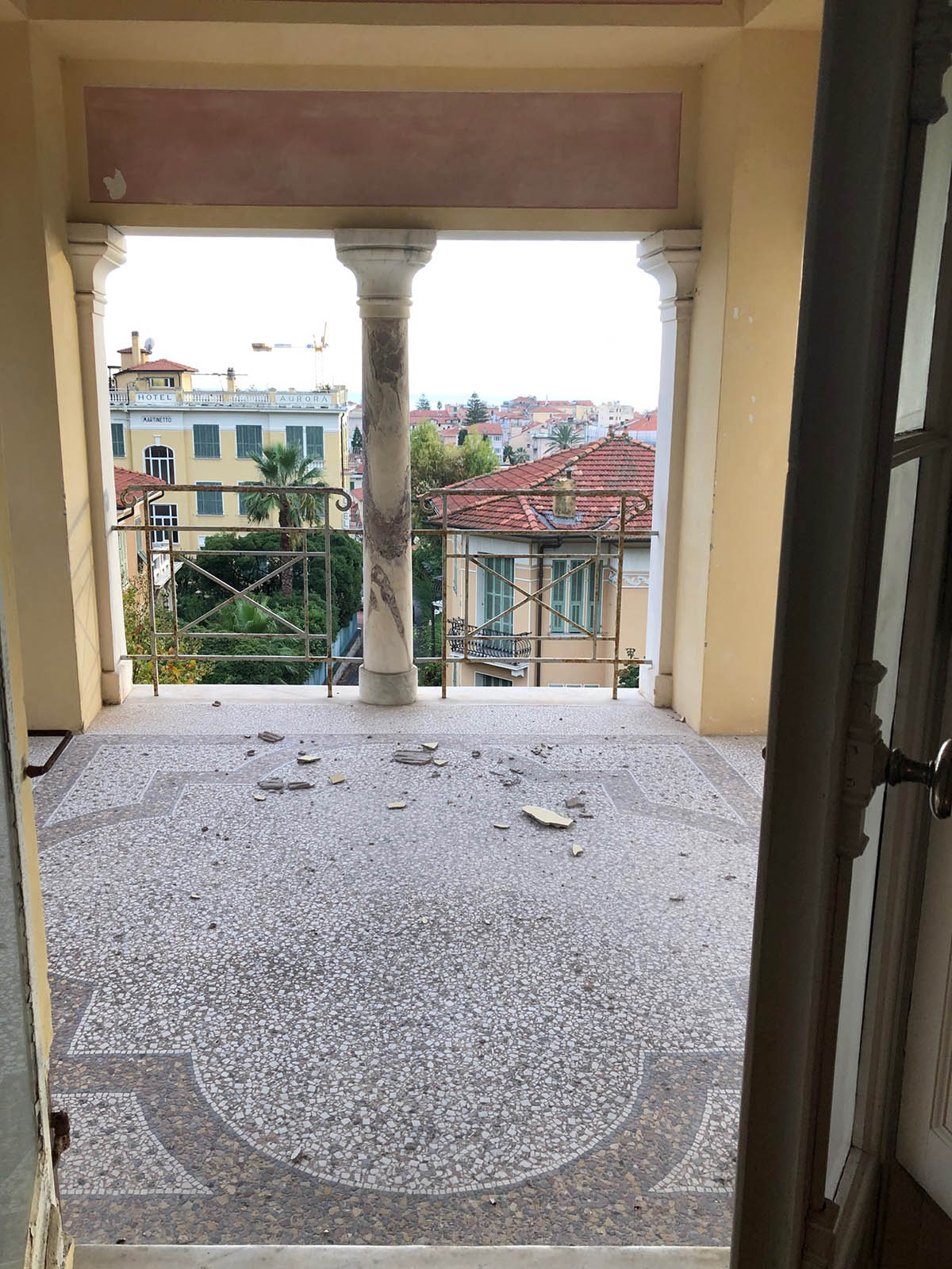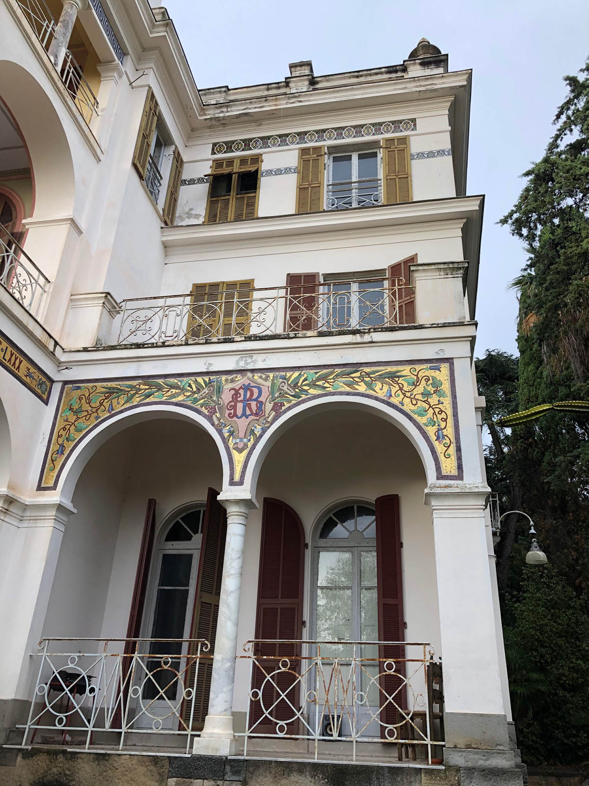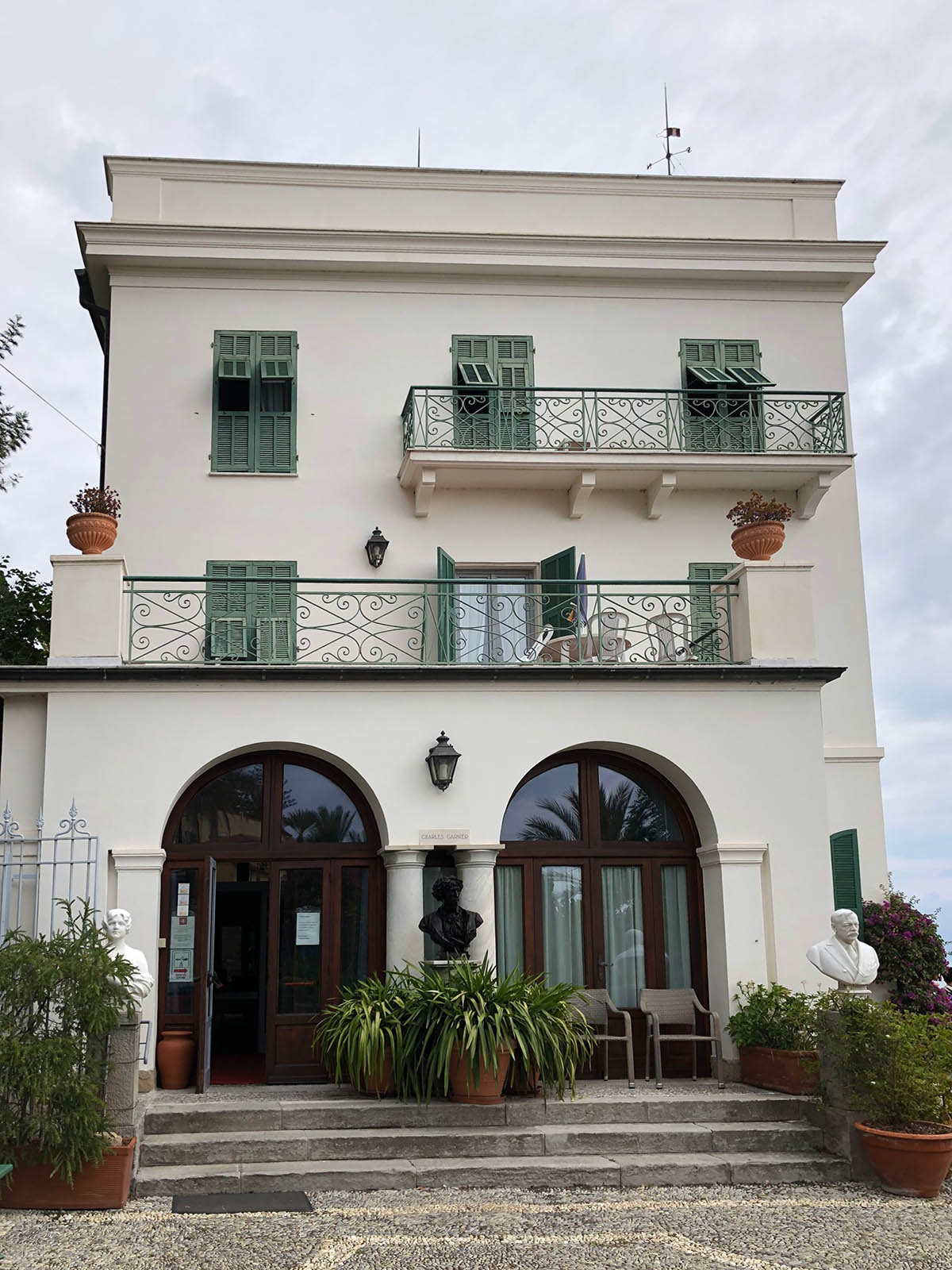 Se pare că bancherul Bischoffsheim a contribuit la finanțarea costurilor cu mult depășite pentru terminarea renumitei Operei. Admirând vila din Bordighera a arhitectului devenit celebru, el i-a comandat o replică mai somptuoasă pentru el și înalta sa societate. Pe ecran am admirat fotografii decolorate cu splendidele saloane. Ni s-au dezvăluit detalii din perspectivele pictate de Monet pe terasa vilei, inclusiv un pin ars și spintecat de fulger în plan secund. Am mai aflat că vila a adăpostit printre alte personaje celebre pe Regina Margherita a Italiei, Louis Pasteur precum și the Queen Mother a actualei regine a Angliei. Abia în ultimul sfert de oră al interminabilei prelegeri am fost în sfârșit invitați să parcurgem în persoană edificiul. Scena din Fellini s-a transformat într-una din Marile Speranțe ale lui Dickens.