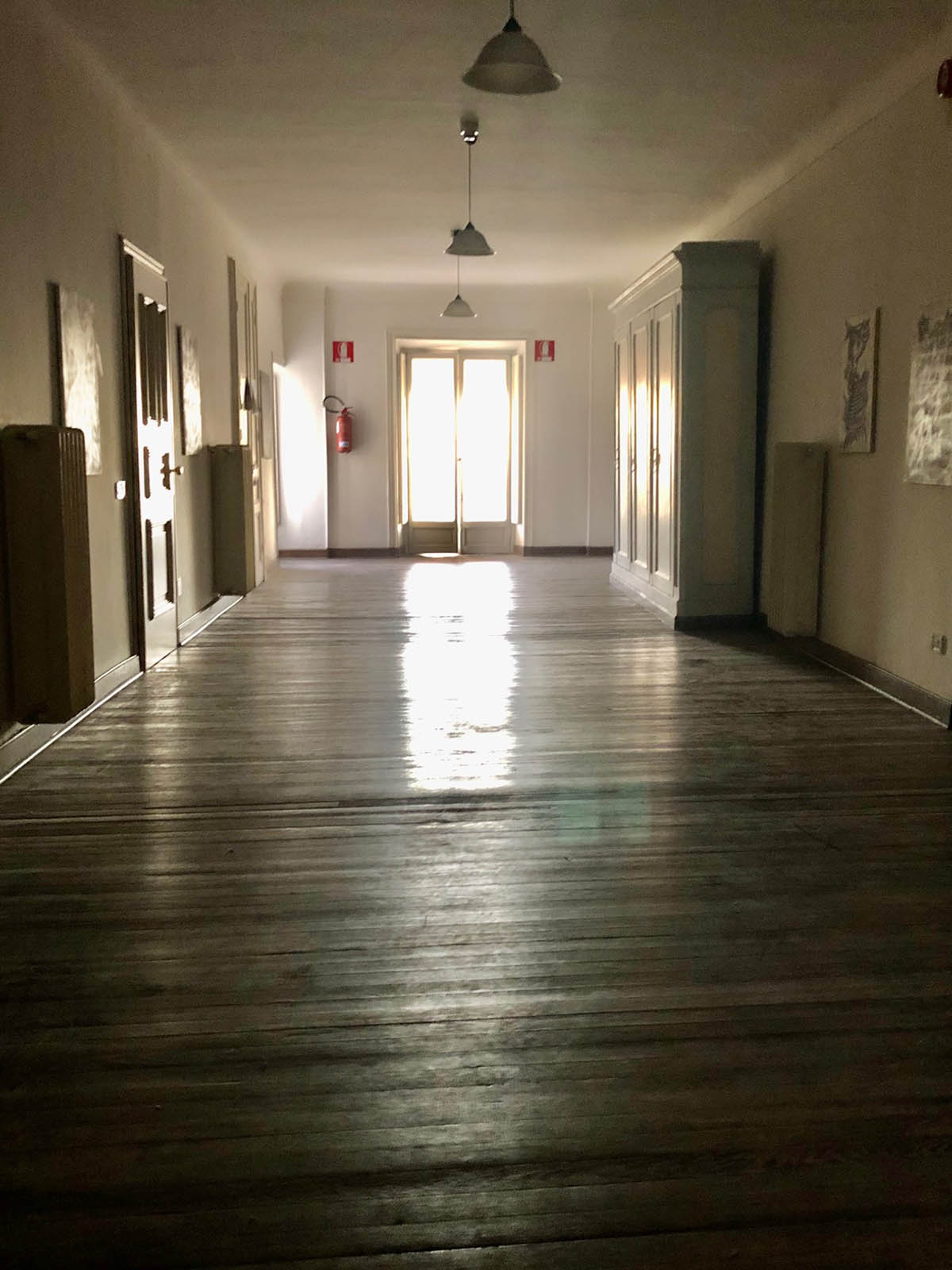 Am străbătut în semiîntuneric ca niște năluci două etaje cam pustii cu uși închise.
