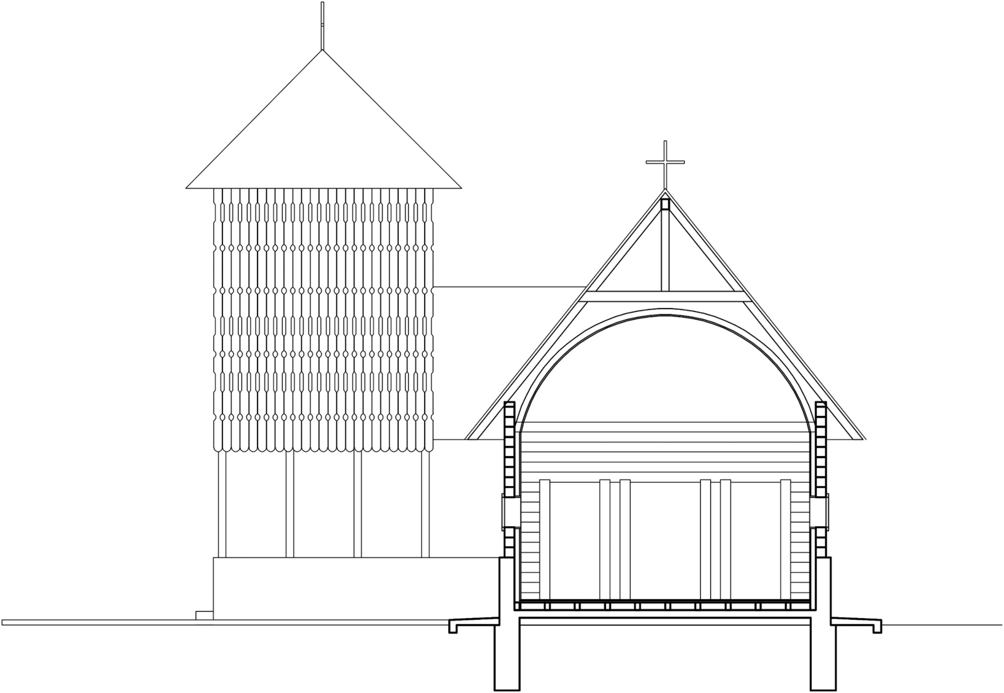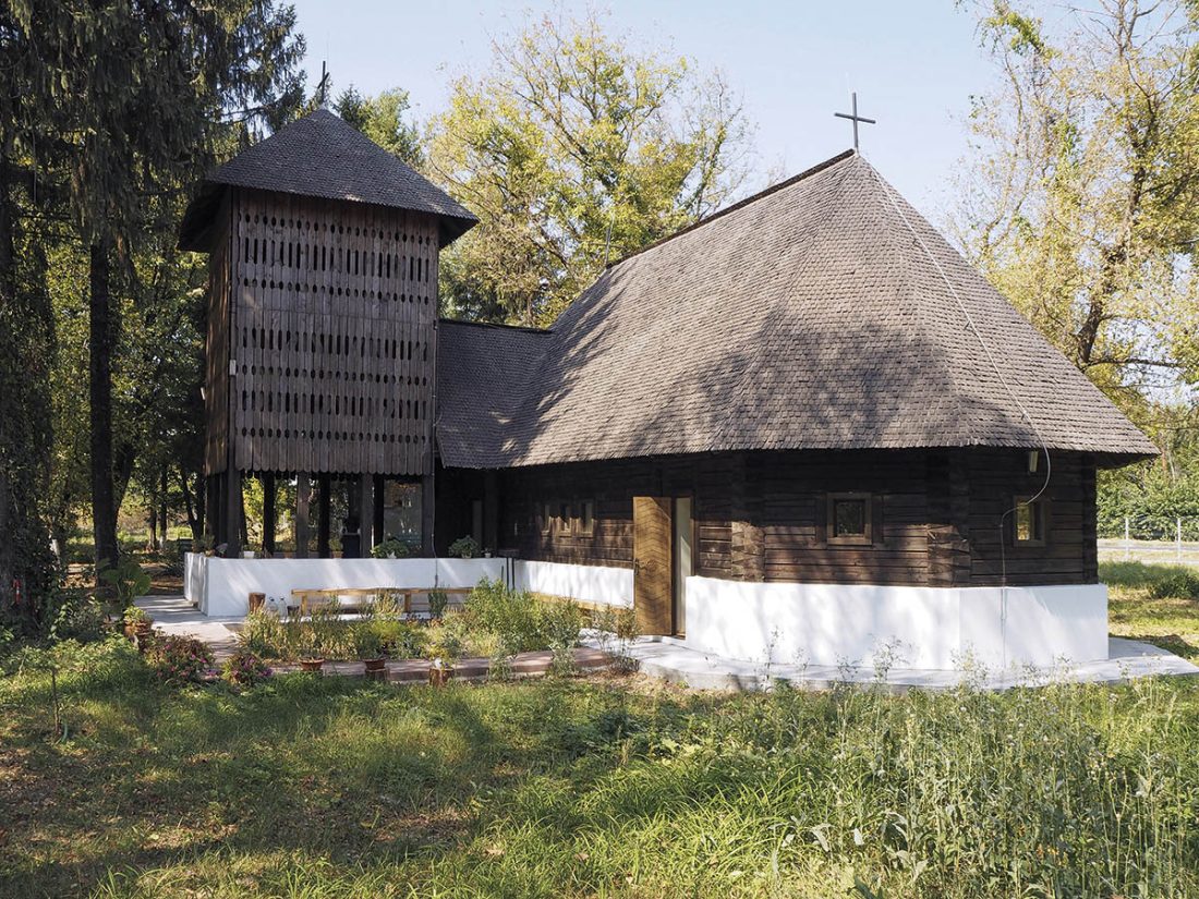 Ne-am orientat căutările în spațiul bisericilor de lemn din zona Munteniei, încercând să vedem ce putem recupera de acolo, să reunim într-un singur edificiu două programe vecine – biserică și clopotniță (gândindu-ne că dacă nu o proiectăm de la început, ea oricum o să apară la un moment dat, și poate nu într-o formă arhitecturală onorabilă). Proiectul constă în această asociere a unei biserici navă (adică fără abside și fără turlă), o biserică precum o casă, derivată din arhetipul locuinței rurale, cu un turn-clopotniță care s-a atașat lateral și care a creat și un pridvor adânc – un spațiu de intrare și potrivit unor slujbe în aer liber.