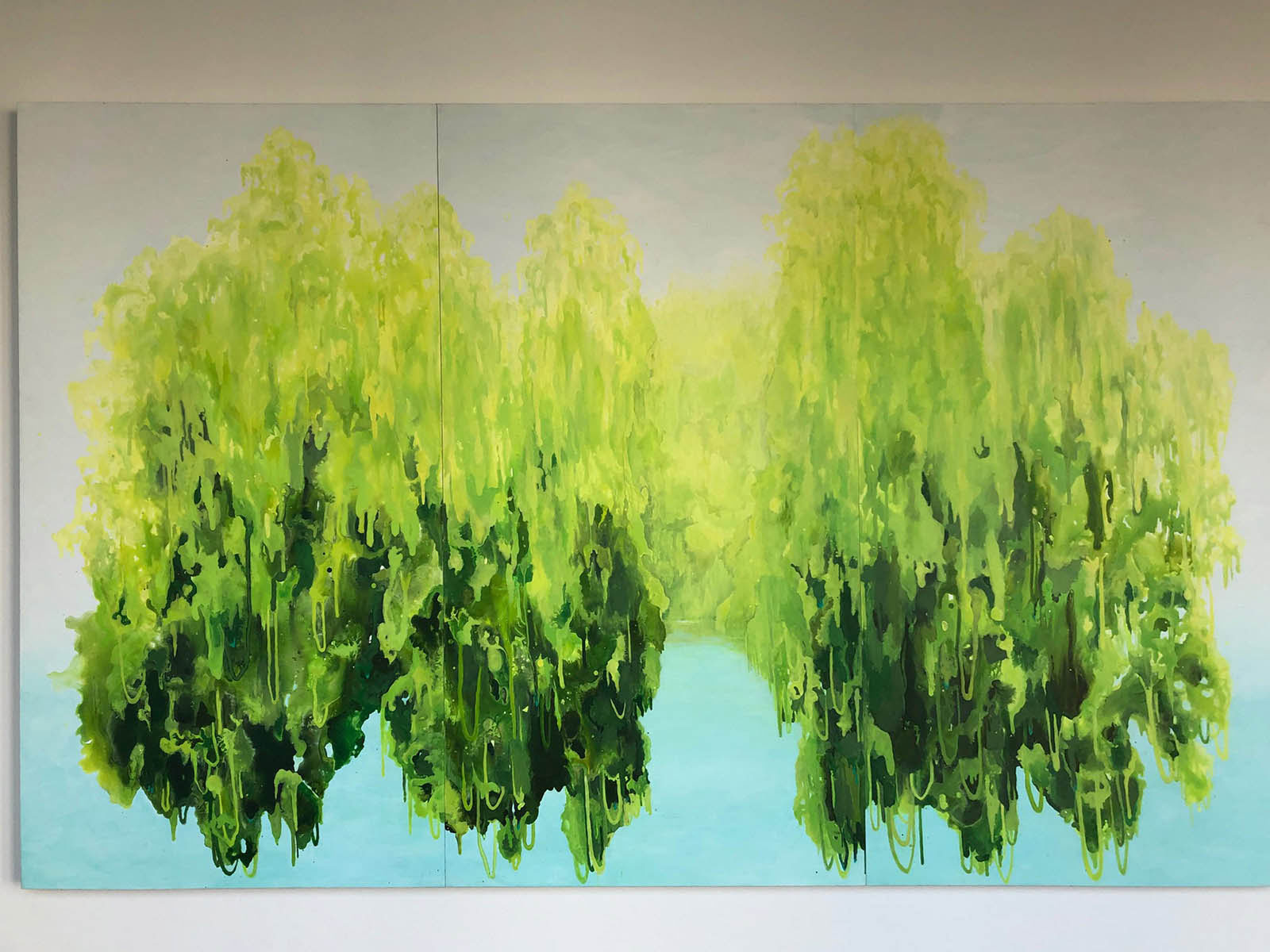 ”Lucky trees”, lucrarea Christinei Fessler, conferă energie și vigoare într-un colț stingher.