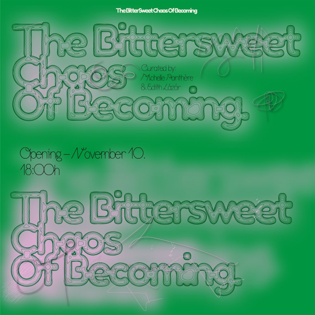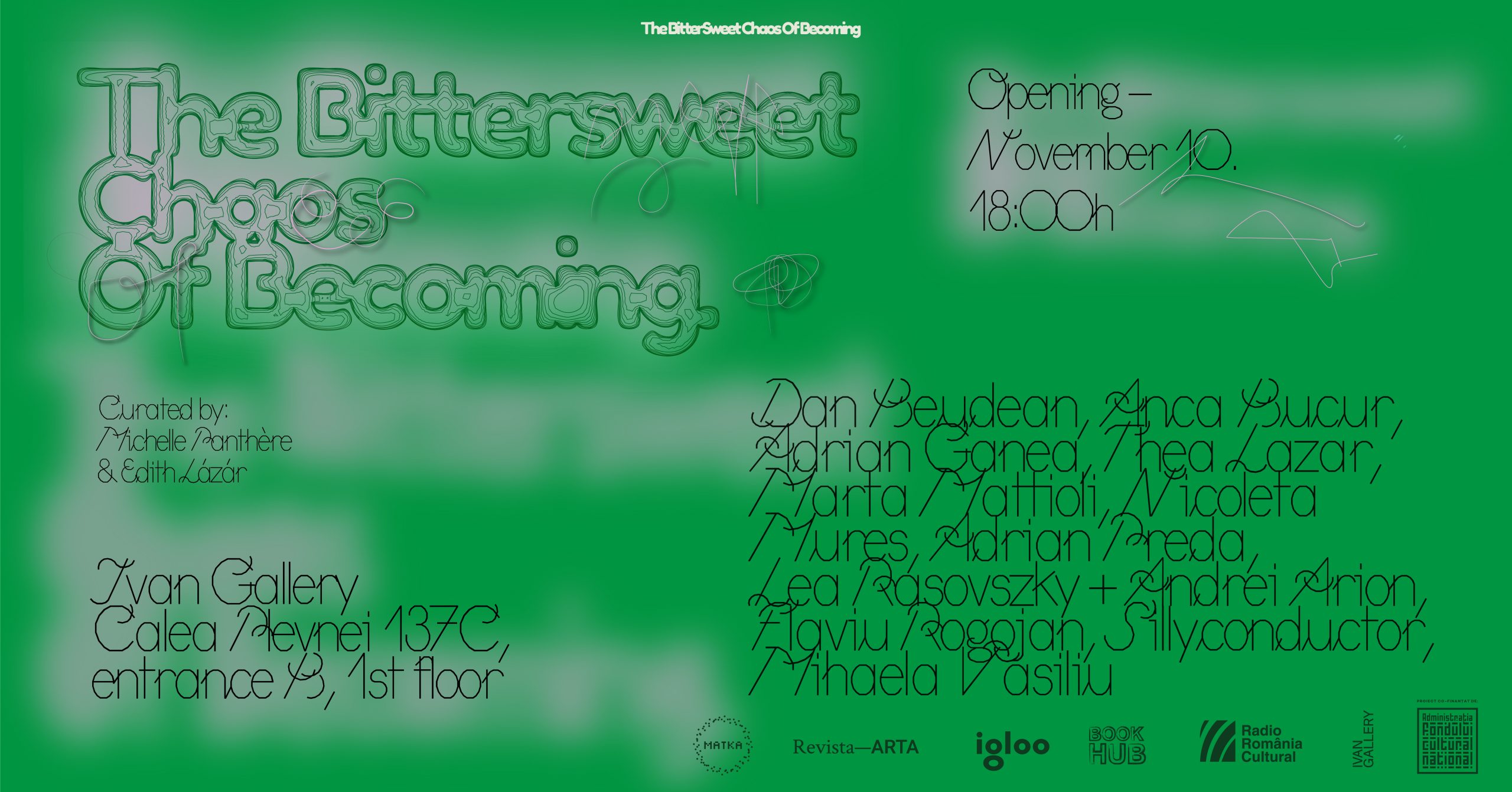 Joi, 10 noiembrie, între orele 18:00-21:00, are loc vernisajul expoziției de grup „The Bittersweet Chaos of Becoming” („Haosul dulce-amărui al devenirii”) la Galeria IVAN, clădirea Malmaison, Calea Plevnei nr. 137C, corp B, etaj 1.