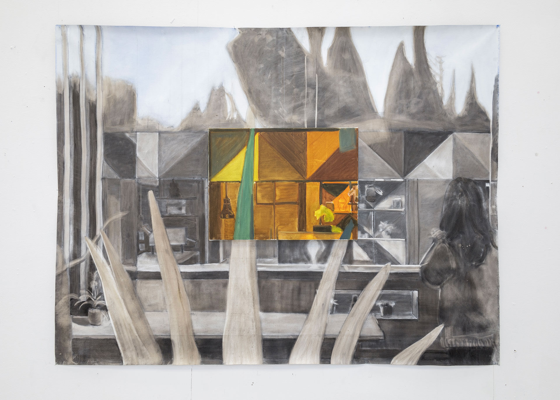 Adrian Cojocaru, Going anywhere, we were vulnerable, 2024, cărbune și ulei pe pânză și ulei pe pânză atașată, 138 x 180 cm și 45 x 60 cm