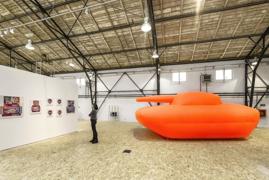D.M.: Evident că arhitectura și spațiul sunt absolut esențiale și aș da aici două exemple: unul ar fi legat de o expoziție de acum câțiva ani pe care am realizat-o la AE împreună cu artistul ungar Antal Lakner, și care se numea „Casa Activa: Utopia Future Home”. Ne-am jucat cu spațiul expozițional, o jumătate din el era tratat ca un fel de showroom imobiliar pentru lucrările lui noi, ca un apartament al viitorului, care proiecta un set de false experiențe ale raportului cu natura. De exemplu, în sufragerie, în loc de canapea, era un munte pe care trebuia să te cațeri, cada era un loc de spa cu sâmburi de cireșe, dormitorul era un pat de masaj care declanșa somnul REM și sufrageria era insula Ada Kaleh. Nu era întâmplător că expoziția avea loc în spațiul permanent al fundației, parte din complexul ISHO. Ne întrebam cum ar arăta apartamentul viitorului. Era o întrebare interesantă pentru el.