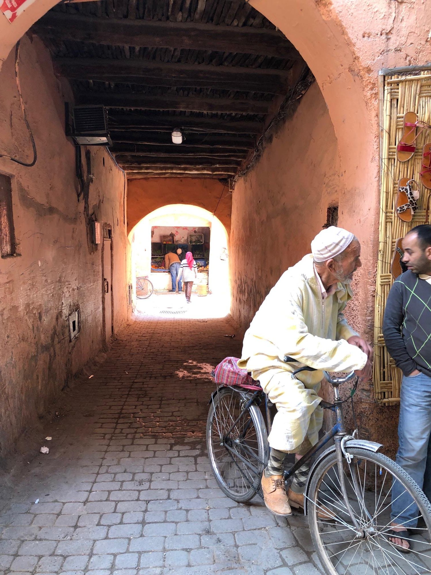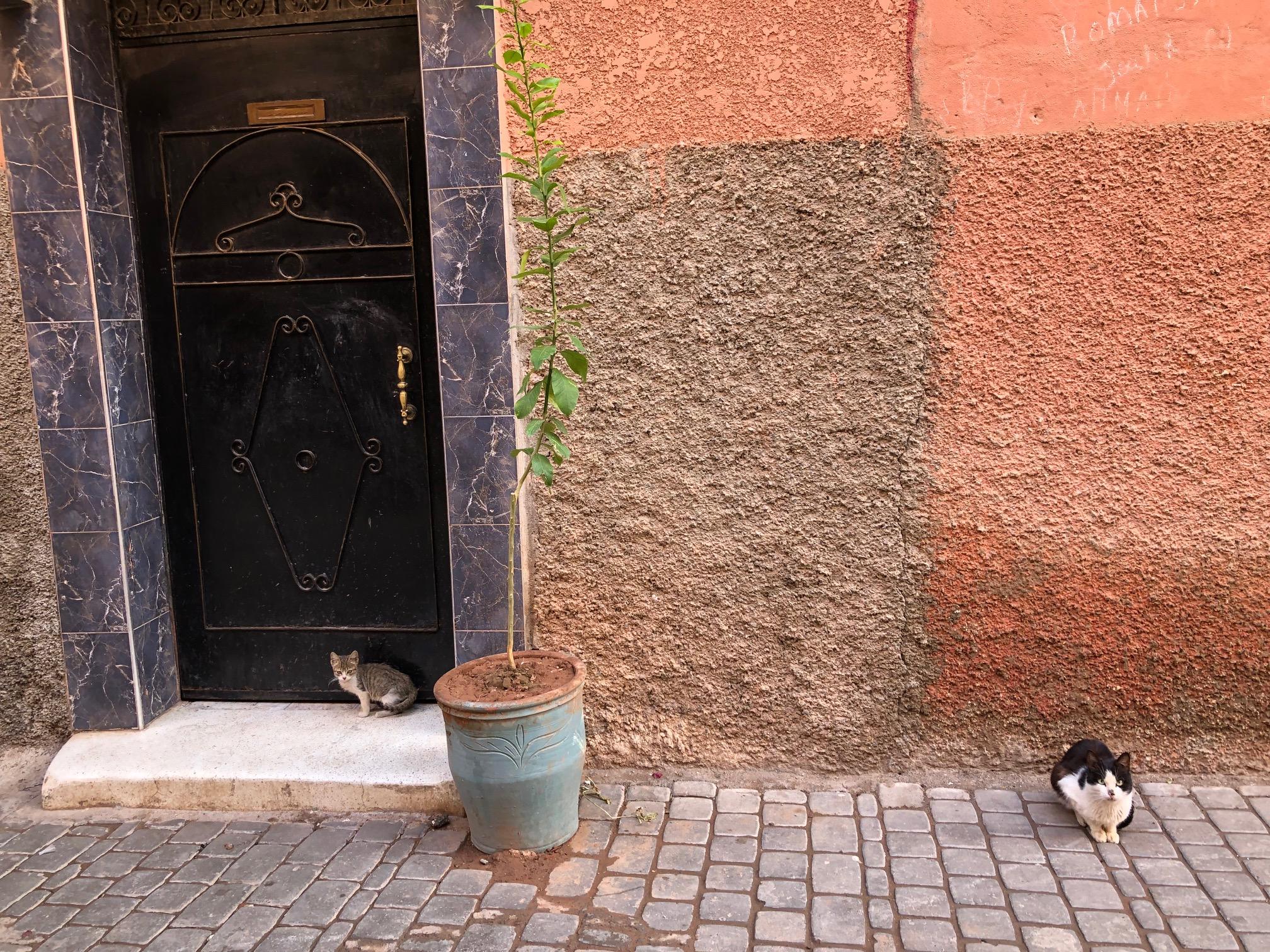 În prezent, străzile sunt pavate, canalizarea și electricitatea funcționează, viața trepidează în Medina. Buticurile turistice alternează cu magazinele de uz cotidian tot așa cum în spatele zidurilor secretoase fără ferestre proprietățile alese alternează cu locuințele obișnuite. Posesia unui Riad este la modă nu numai printre artiști și bogătași cum ar fi Alain Delon, Mick Jagger sau Kate Moss, ci și pentru numeroși pensionari din întreaga lume în căutarea unei clime mai calde. În afara rezidențelor personale, mulți și-au deschis porțile pentru turism. Marrakech-ul numără aproximativ 1 400 de astfel de mici hoteluri care au între 5 și 20 de camere. Riad Basim are 6 camere decorate cu gust în stil oriental, o bucurie a ochiului: lămpi de metal dantelat în tavan și nișe special construite care rămân aprinse toată ziua, divane cu perne și măsuțe joase, textile colorate, plăcuțe de argilă monocromă pe jos și faianță colorată pe sus, stucatură dantelată incizată de mână cu dalta – o specialitate a Marrakech-ului pe care o întâlnim peste tot: în cele mai somptuoase palate, dar și în restaurante. Proprietara ne întâmpină cu ceai de mentă, prăjiturele și ne oferă toate informațiile necesare. Dimineața ni se servește un mic dejun excelent cu specialități pe care le-am văzut pe stradă, însă nu am avut curajul să le încercăm. Dacă luăm micul dejun pe terasă, vedem că edificiul în care ne aflăm este parte integrantă din zidul masiv care delimitează Medina de zona modernă a orașului. De partea cealaltă a străzii moderne se întinde o imensă plantație de portocali, iar în spatele ei se profilează chiar palatul regal.