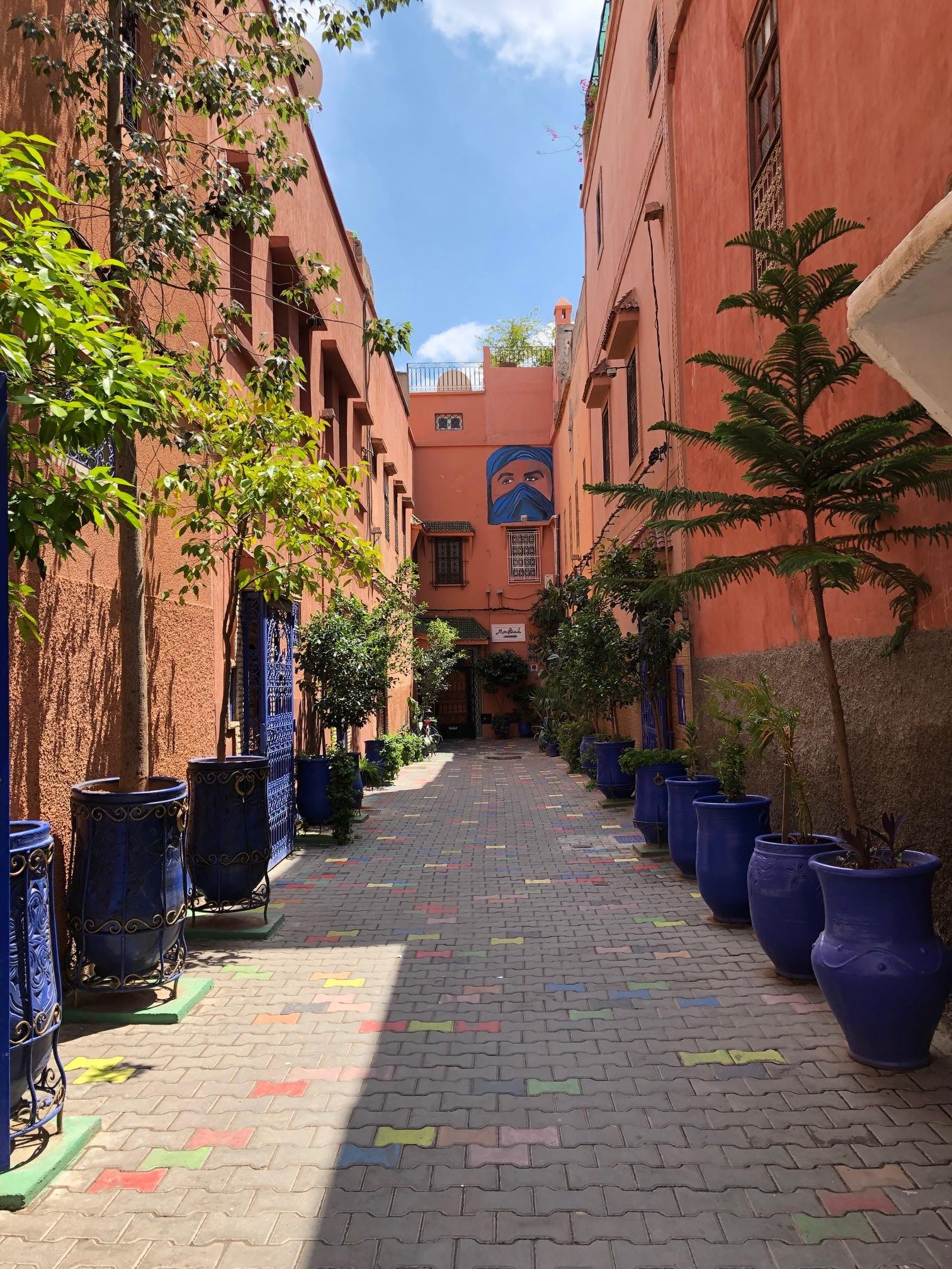 Taxiul ne oprește în fața unei arcade. De acolo o luăm pe jos într-o zonă în care, pe lângă pietoni, doar bicicletele și motocicletele mai pot pătrunde. Strada este mai strâmtă, dar mai îngrijită, sentimentul de interior se accentuează: ghivece de flori și mici arbori se profilează armonios cu verdele lor proaspăt pe culoarea teracotei. Această combinație cromatică ne va urmări pe întreg parcursul excursiei ca un numitor comun al Marocului. După vreo cinci-șase curbe, urmărind afișul minuscul cu numele hotelului și întrebând localnicii prietenoși și dornici să ne ajute, ajungem la o ușă impozantă într-un cul-de-sac. După un scurt culoar întunecos, intrăm într-o superbă curte interioară luminată natural de sus, discret decorată, cu havuz în mijloc și coloane de jur-împrejur: Riad Basim – Maison d’Hôtes.