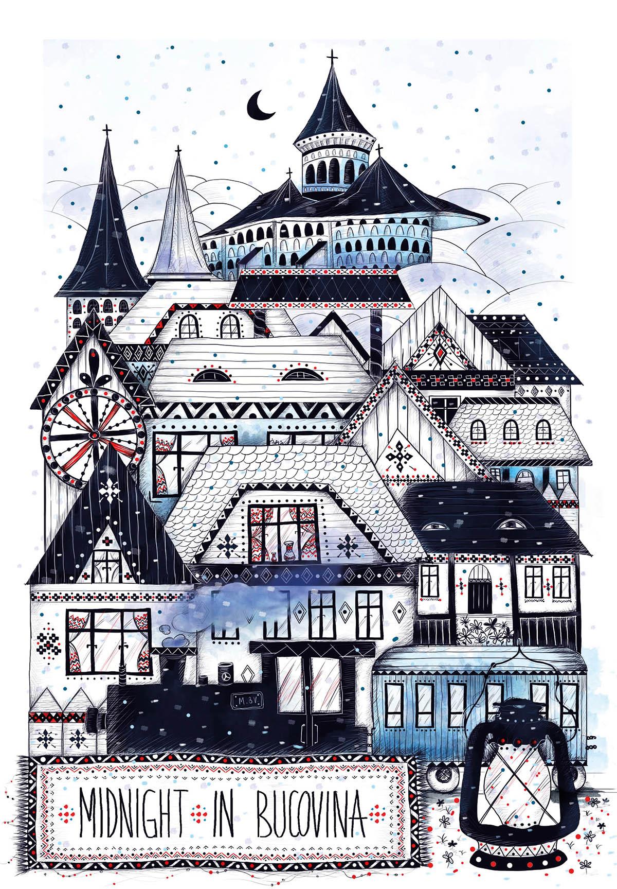 Ilustrez oraşe sau zone pe care le-am vizitat şi de care m-am îndrăgostit. Îmi place să surprind specificul căsuţelor din fiecare loc, culorile şi motivele tradiţionale, sau să mă joc cu tramvaie, biciclete, trenuri sau metrouri galbene. Toate exprimă spiritul şi energia oraşului în mişcare continuă.