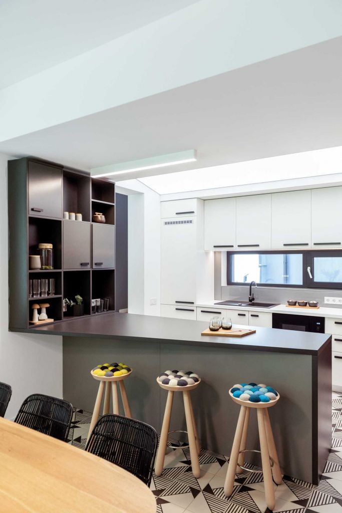 Casa A are un aer ușor industrial, cu mobilier de metal, finisaje cu geometrii mai riguroase şi unghiuri mai ascuțite, precum şi pereţi din cărămidă aparentă ce reprezintă o continuare a exteriorului în interior. Mobilată cu precădere cu piese în tonuri de gri, ea include, de asemenea, în zona de living, şi măsuţa modulară ForMe, creată tot de Atelier MASS, cu o tăblie cu detaliu din licheni. În bucătărie, taburetele din zona de bar aduc, la rândul lor, o mică pată de culoare ce îmblânzeşte discret linia industrială.