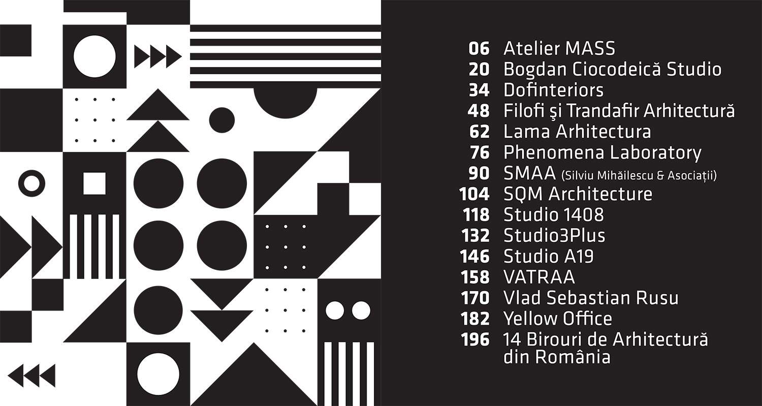 A ≤ 40. 14 Birouri de arhitectură din România se adresează nu doar tuturor celor preocupați de dinamica peisajului arhitectural contemporan românesc, ci și iubitorilor de carte-obiect, albumul remarcându-se printr-o compoziție grafică singulară în colecțiile igloo, semnată de Cătălin Artenie.