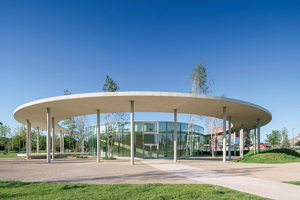 Arhitectura propusă în parc (sub forma unor pavilioane) este discretă, în dialog cu elementele vegetale. Piesele construite se articulează într-un limbaj arhitectural unitar, utilizând ca materiale betonul și metalul. Pavilionul comunitar central impresionează prin forma circulară și vitrajul desfășurat pe toată circumferința sa, ce îi asigură deschidere spre cadrul natural și accesibilitate. Terasele înierbate ale pavilioanelor contribuie la disimularea acestora în amenajările vegetale ale parcului.