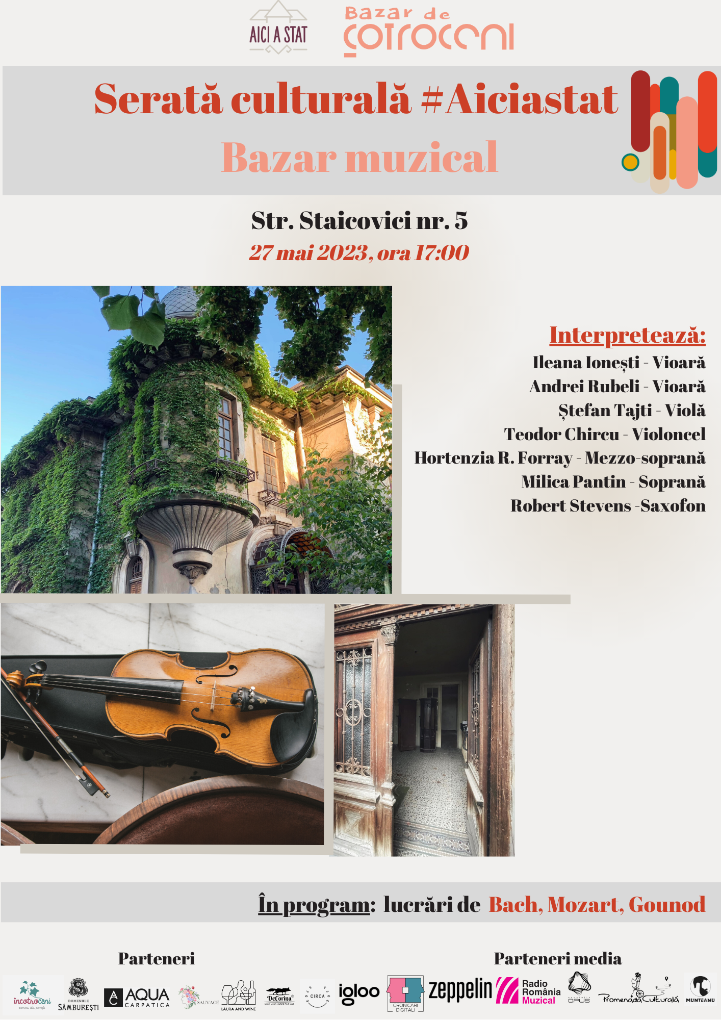 Asociația culturală Aici A Stat vă invită la o serată culturală într-una dintre cele mai fotografiate case istorice din cartier, care, cu ocazia evenimentului Bazar de Cotroceni, va fi deschisă în premieră. Publicul va avea ocazia să pășească în interiorul vilei interbelice de pe Strada Dr. Niculae D. Staicovici nr. 5 și să asculte note muzicale pe aranjamente de lucrări de muzică clasică, un adevărat Bazar muzical în interpretarea Ansamblului cameral #Aiciastat cu invitați surpriză.