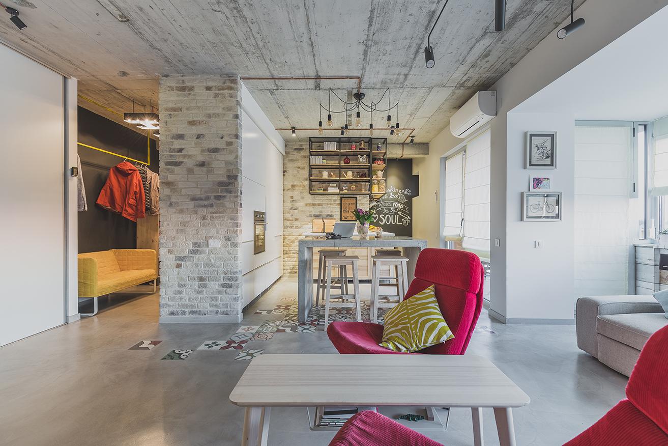 Inspirându-se din tradiţia amenajărilor de baruri şi restaurante încadrabile în curent, arhitecta a optat pentru expunerea plăcii de beton a tavanului, pe care circulă „libere” cabluri şi care primeşte o diversitate de corpuri de iluminat în zonele-cheie (canapeaua, insula şi blatul din bucătărie). Coloristic, se intersectează în acest spaţiu deschis tonuri albe şi neutre la nivelul finisajelor, atât parietal, cât şi pe podea. Pe acest fundal intervin accentele: roşul textil ori multicolorul cărţilor şi al obiectelor decorative din living.