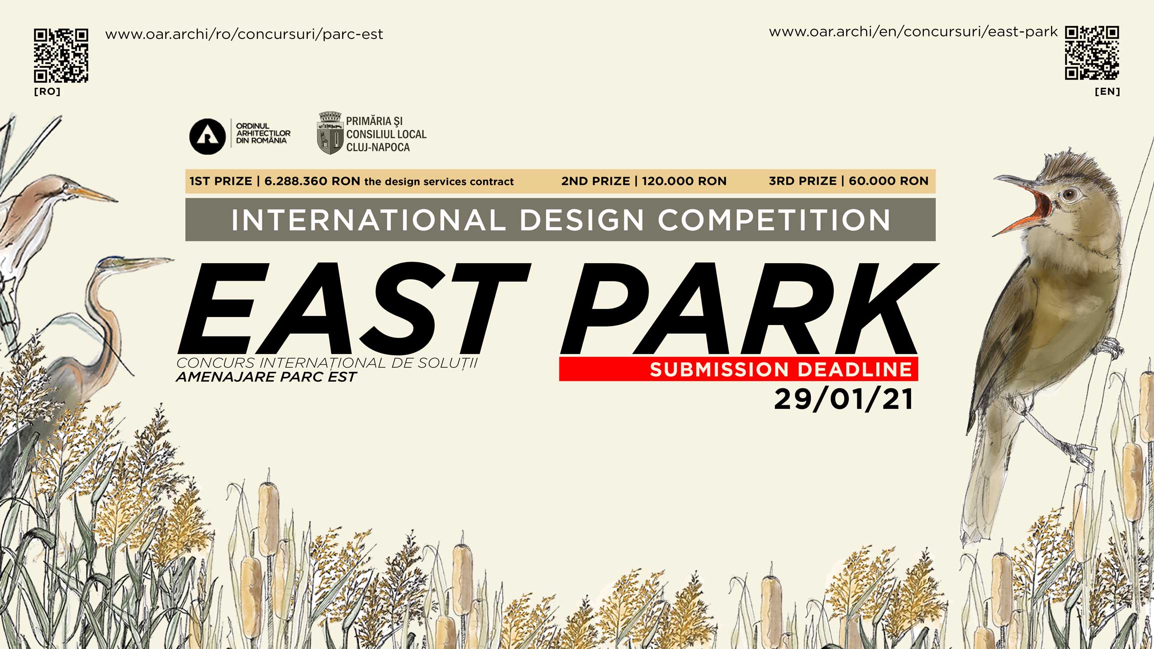 Ordinul Arhitecților din România și Primăria Municipiului Cluj-Napoca anunță oficial lansarea Concursului Internațional de Soluții ”Amenajarea Parcului Est Cluj-Napoca”. Concursul are ca scop selectarea celei mai bune soluții în vederea amenajării Parcului Est din Cluj-Napoca, pentru atribuirea contractului de proiectare. Noua amenajare va trebui să asigure
