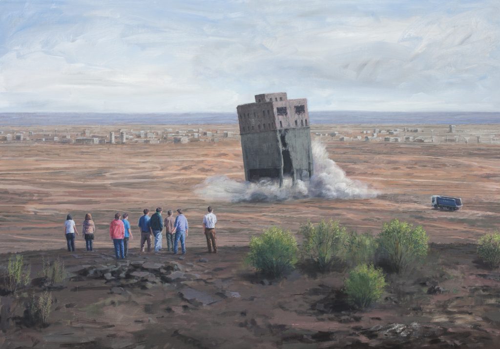 ȘERBAN: Una dintre trăsăturile personajelor mele este că sunt noneroice, dar, în același timp, emblematice pentru un grup social. Ele reprezintă acest personaj colectiv al omului tranziției, al fostului „om nou”, devenit marginal odată cu schimbarea regimului politic. Lipsa detaliilor figurilor era importantă în acest context. Apoi, desigur, faptul că multe dintre personaje sunt privite de la distanță, de deasupra, le face anonime. Intenția mea era să privesc de sus ca să pot înțelege mai bine contextul, „peisajul”. De la nivelul solului nu ai o perspectivă largă, nu poți vedea cum e structurat spațiul din jurul personajelor, lucru esențial în înțelegerea lor, peisajul devenind astfel, la rândul lui, un personaj purtător de sens, încărcat de istorie. Am numit această relație cu personajele mele empatie distantă.