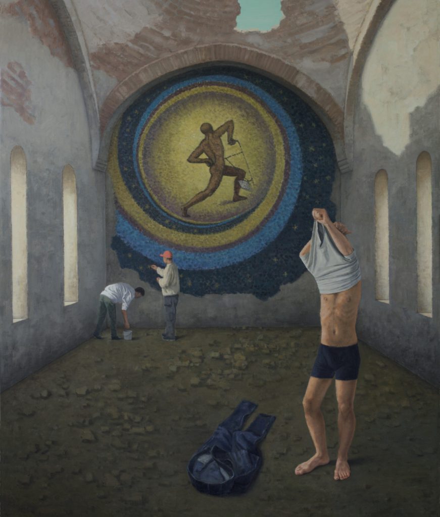 ȘERBAN: Curgerea timpului este un subiect recurent în istoria artelor, e o temă care și pe mine mă interesează. În ultimii ani, am fost foarte interesat în picturile mele de „colapsul” timpului istoric, de exemplu, în seria „capriciilor” suprapun subiecte, imagini, obiecte care nu aparțin aceleiași epoci, tocmai în ideea relativizării timpului ca fundament în înțelegerea artei. Astfel, am încercat să îmi imaginez câteva scene realist socialiste în alte contexte decât cele în care au fost create, de pildă, în situri arheologice sau în biserici în ruină. Detașarea de context ne poate ajuta uneori să ajungem la o înțelegere mai profundă, prin estomparea detaliilor nesemnificative și prin comparația directă cu alte epoci.