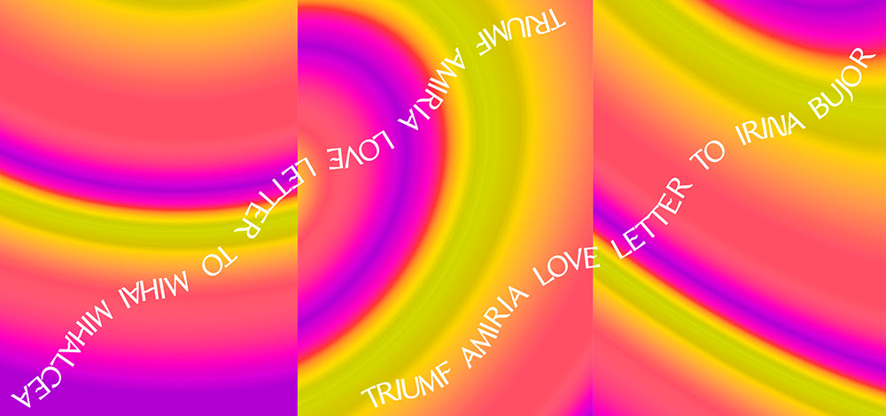 În continuarea formatului curatorial „LOVE LETTER TO […]”, inițiat în 2021 ca parte a conceptualizării TRIUMF AMIRIA, KILOBASE BUCHAREST și KUNSTHALLE BEGA Timișoara prezintă TRIUMF AMIRIA LOVE LETTER TO IRINA BUJOR și TRIUMF AMIRIA LOVE LETTER TO MIHAI MIHALCEA: două expoziții solo care aduc împreună poziții artistice queer, puse într-un dialog despre posibilitatea de revizitare și redimensionare continuă a unor lumi care, mai degrabă decât să fie divergente, sunt suprapuse și se întrepătrund. Expoziția lui Mihai Mihalcea scoate la iveală un proces, subtil și intens deopotrivă, de negociere cu identitățile artistice asumate de-a lungul timpului, „privirea în secțiune” devenind mobilul dezvoltării practicii sale artistice. În paralel, expoziția Irinei Bujor vorbește despre o încercare neobosită de a-și redefini universul, în care empatia, identitatea, viitorul sunt investite cu sensuri mereu neașteptate.