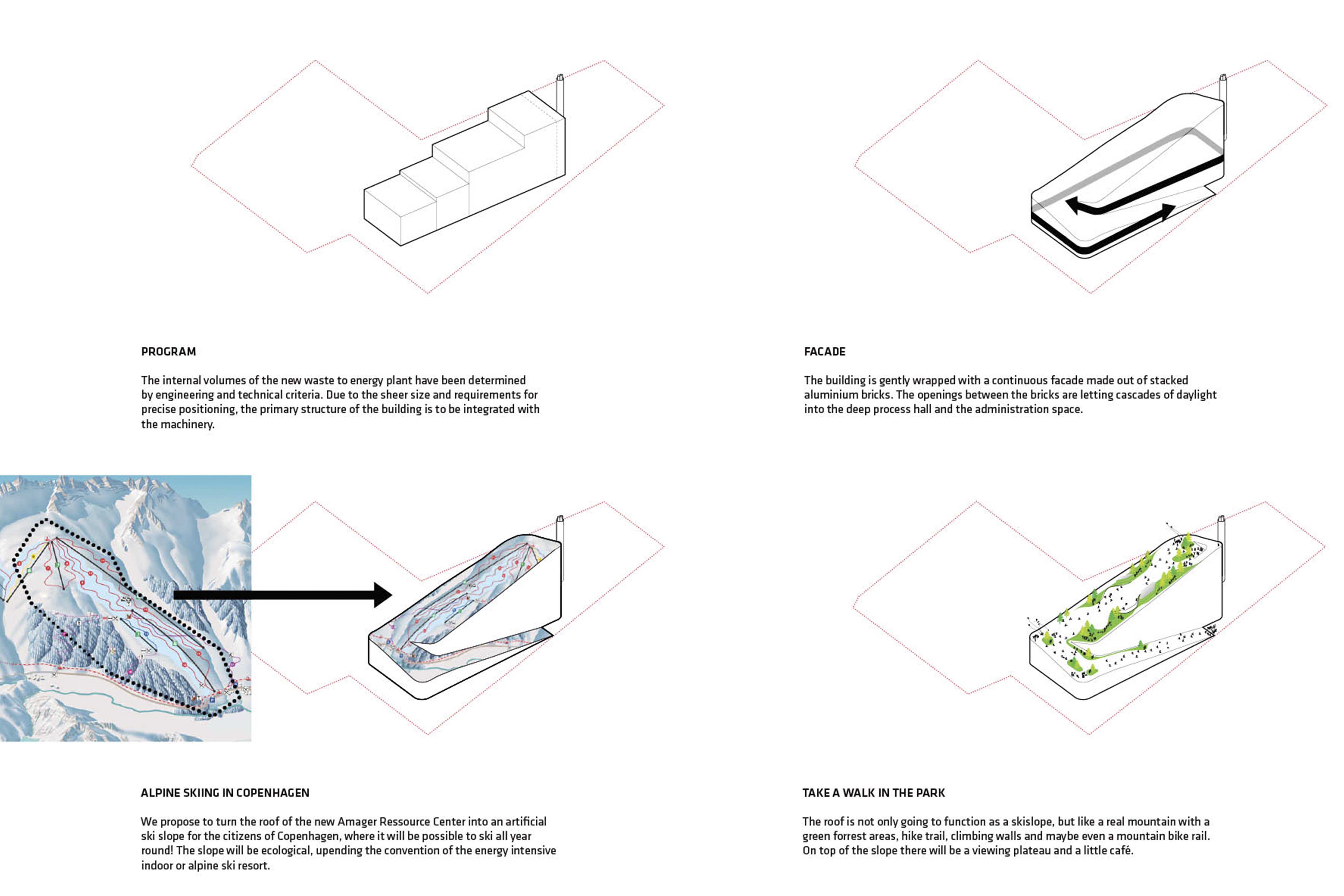 PROJECT: Copenhill / Amager Bakke | ADDRESS: Copenhagen, Denmark | SIZE IN m²: 41000 | ARCHITECTURE: BIG – Bjarke Ingels Group | PARTNERS: Bjarke Ingels, David Zahle, Jakob Lange, Brian Yang | PROJECT LEADERS: Jesper Boye Andersen, Claus Hermansen, Nanna Gyldholm Møller | COLLABORATORS: SLA, Lüchinger+Meyer, MOE, Rambøll, Jesper Kongshaug and BIG Ideas; AKT, Topotek 1, Man Made Land, Realities:United | TEAM: Alberto Cumerlato, Aleksander Wadas, Alexander Codda, Alexander Ejsing, Alexandra Gustafsson, Alina Tamosiunaite, Armor Gutierrez, Anders Hjortnæs, Andreas Klok Pedersen, Annette Jensen, Ariel Wallner, Ask Andersen, Balaj IIulian, Blake Smith, Borko Nikolic, Brygida Zawadzka, Buster Christensen, Chris Falla, Chris Zhongtian Yuan, Daniel Selensky, Dennis Rasmussen, Espen Vik, Finn Nørkjær, Franck Fdida, Gonzalo Castro, Gül Ertekin, George Abraham, Helen Chen, Henrick Poulsen, Henrik Rømer Kania, Horia Spirescu, Jakob Ohm Laursen, Jean Strandholt, Jelena Vucic, Jeppe Ecklon, Ji-young Yoon, Jing Xu, Joanna Jakubowska, Johanna Nenander, Kamilla Heskje, Katarzyna Siedlecka, Krzysztof Marciszewski, Laura Wätte, Liang Wang, Lise Jessen, Long Zuo, Maciej Zawadzki, Mads Enggaard Stidsen, Marcelina Kolasinska, Marcos Bano, Maren Allen, Mathias Bank, Matti Nørgaard, Michael Andersen, Narisara Ladawal Schröder, Niklas A. Rasch, Nynne Madsen, Øssur Nolsø, Pero Vukovic, Richard Howis, Ryohei Koike, Se Hyeon Kim, Simon Masson, Sunming Lee, Toni Mateu, Xing Xiong, Zoltan David Kalaszi, Tore Banke, Yehezkiel Wiliardy | STATUS: Finalised in 2019 | PRIZES: 2020 Popular Science Best of What’s New Award, 2020 ICONIC Innovative Architecture Best of the Best Award, 2020 German Design Council Innovative Architecture Best of the Best Award, 2020 Architizer A+ Awards Factories & Warehouses Popular Winner, 2020 Design Educates Award, 2020 ArchDaily Building of the Year Award, 2019 Scandinavian Green Roof Award, 2015 P/A Progressive Architecture Awards Citation, 2012 AR MIPIM Future Projects Awards Special Award