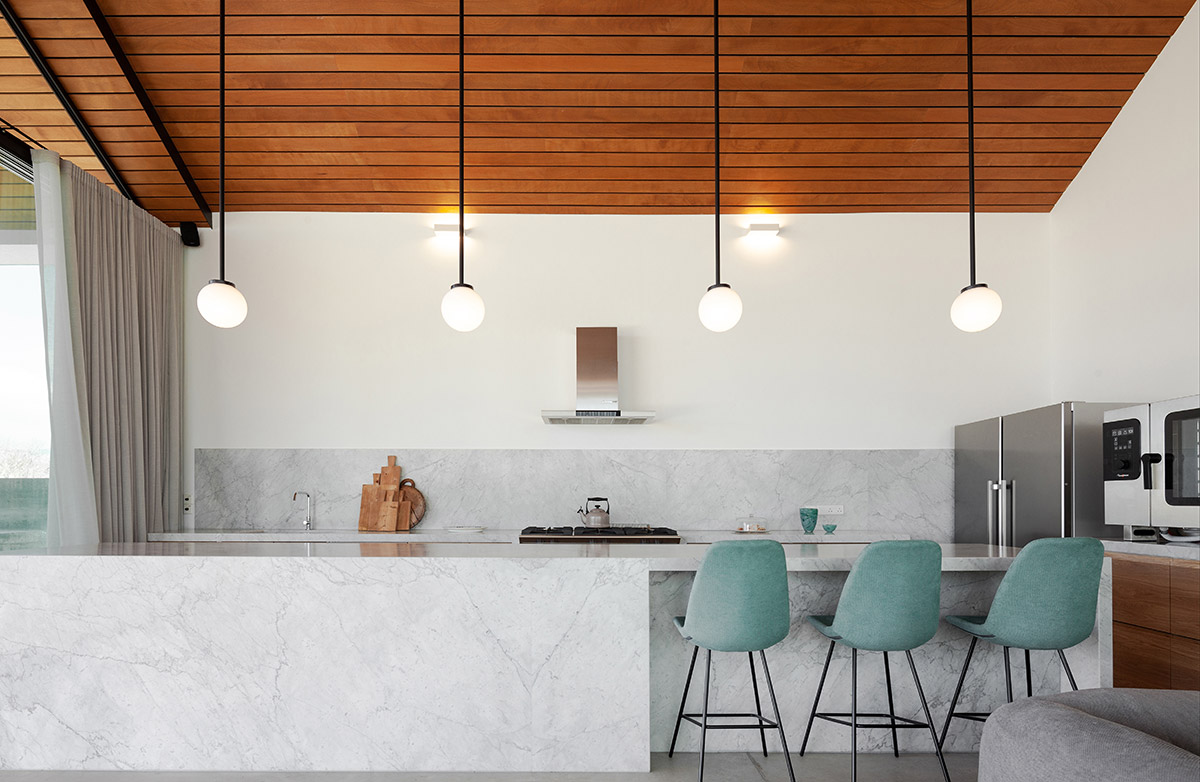 Bucătăria în stil galerie este largă și complet echipată la nivel profesional (datorită faptului că proprietarul este bucătar și adoră mâncarea). Insula funcționează, de asemenea, ca un bar pentru micul dejun și este placată cu marmură albă strălucitoare, masa sa răcoroasă contrastând cu căldura betonului și a lemnului.