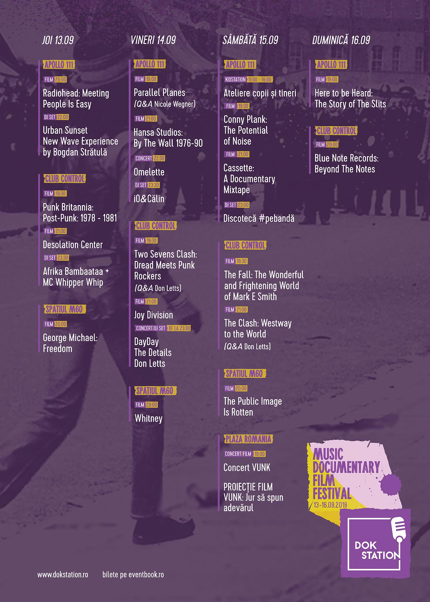 A treia ediție DokStation Music Documentary Film Festival are loc în perioada 13-16 septembrie 2018. Programul proiecțiilor și evenimentelor conexe este disponibil la www.dokstation.ro. Biletele s-au pus în vânzare pe Eventbook.ro.