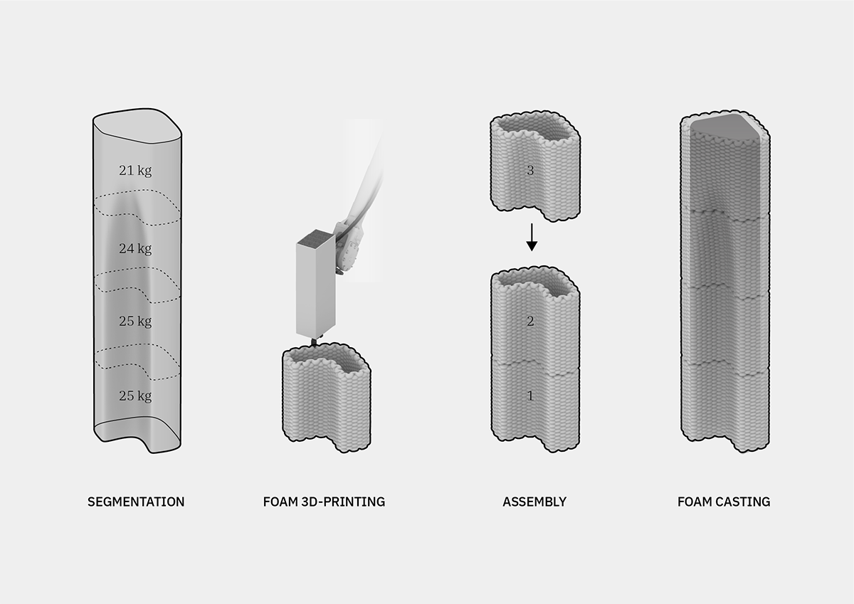 Airlements este cel mai mare prototip construit în cadrul acestui demers de cercetare, constând într-o structură cu înălțimea de 2m, formată din patru segmente cu miez gol imprimate 3D. Imprimarea componentelor a durat mai puțin de o oră, după care acestea au fost lăsate să se întărească timp de o săptămână într-un mediu controlat, cu o umiditate relativă între 20 și 70% și la temperaturi între 20 și 28°C. Altfel spus, prototipul nu a necesitat procese energo-intensive, ceea ce a reprezentat un progres considerabil în raport cu cercetările anterioare legate de materiale tip spume minerale fără ciment.