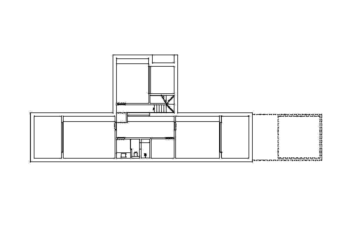 Casa constă în două volume adiacente. Primul, cu o înălțime redusă, dezvoltat pe orizontală, conține zona de zi tip open space, cu living, bucătărie și dining. Cel de-al doilea volum, un paralelipiped înalt, conține scările ce conduc la dormitorul de la etajul superior. De asemenea, scările asigură accesul la zona tehnică amplasată în subsolul iluminat și ventilat natural, grație celor trei curți de la nord, sud și est.
