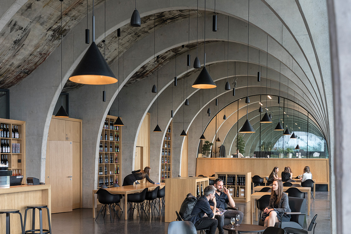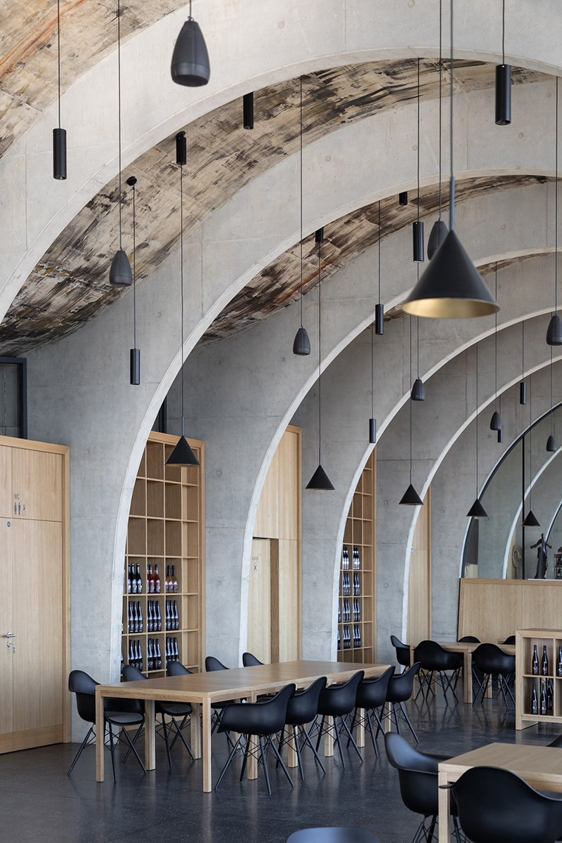 Acest spațiu destinat publicului și degustării atrage prin lumina naturală abundentă, prin geometria dinamică a designului și amprente artistice, etalând pe tavanul curbat o uriașă pictură murală a artistului contemporan ceh Patrik Hábl, ale cărei tușe dense și neregulate, în nuanțe roșiatice și pământii, emană o anume materialitate și amintesc de variațiile solului.