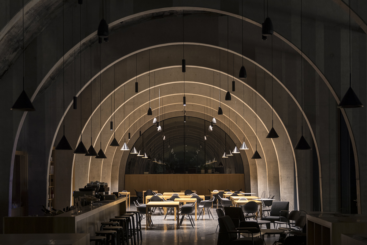 Structura interioară a corpului trimite la vechile pivnițe arcuite, caracteristice regiunii, expunând o colonadă de grinzi boltite ce ritmează spațiul. De altfel, fiecare arc din beton armat este proiectat individual pentru a se potrivi unui unghi specific al tavanului, iar distanța dintre arce o preia pe cea dintre rândurile de viță-de-vie, într-un exercițiu de simetrie vizuală între interior și exterior.