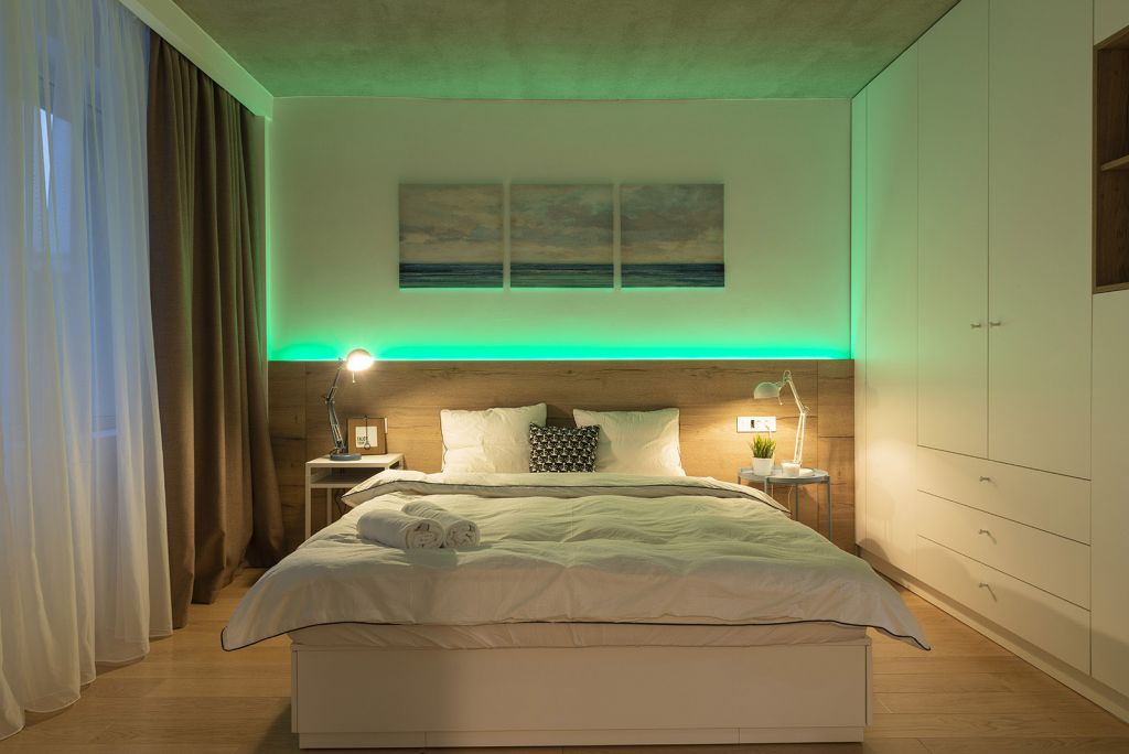 În dormitorul principal, senzaţia de confort este dată de combinaţia dintre lemnul natur şi albul lenjeriei de pat, de textura bogată a draperiilor crem, precum şi de iluminatul ambiental, care invită la relaxare. Dormitorul mic, deşi mai modest, evocă, prin draperii, câteva simboluri ale unor capitale vest-europene, reamintindu-i discret utilizatorului că se află în Micul Paris.