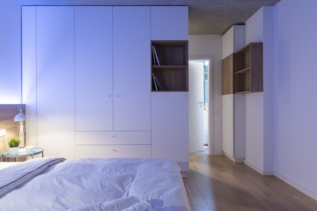 Peretele care separă zona de zi de zona de noapte, formată din două dormitoare şi o baie, nu a putut fi înlăturat, fiind din beton, ceea ce a dictat configuraţia atipică a camerelor, unde cele două dormitoare sunt separate doar de un dulap înalt până în tavan, de asemenea cu două feţe. Nota de industrial dată de cablurile trase aparent, prin ţevi negre, este, de asemenea, rezultatul necesităţii şi al „negocierii” cu pereţii de beton existenţi şi plafonul din acelaşi material, şi el lăsat aparent şi finisat cu tencuială gri.