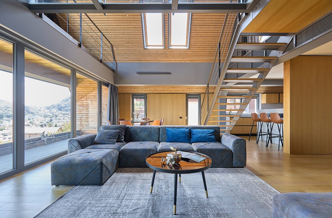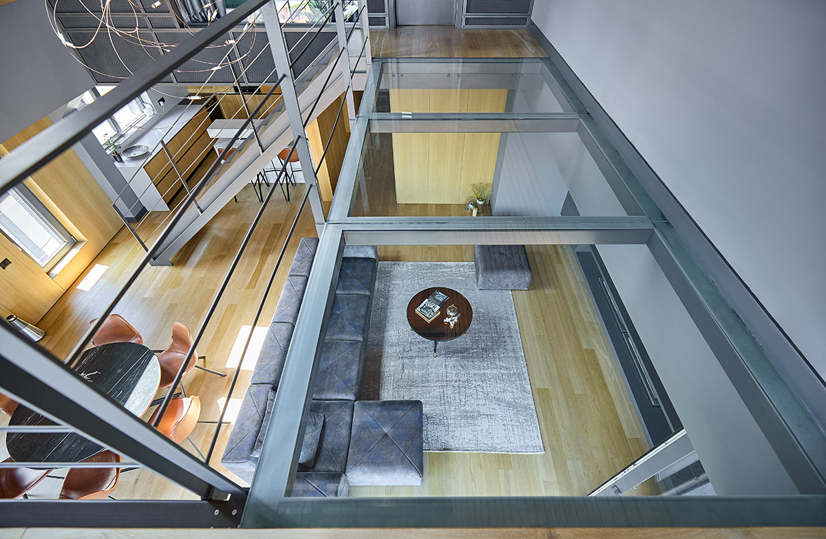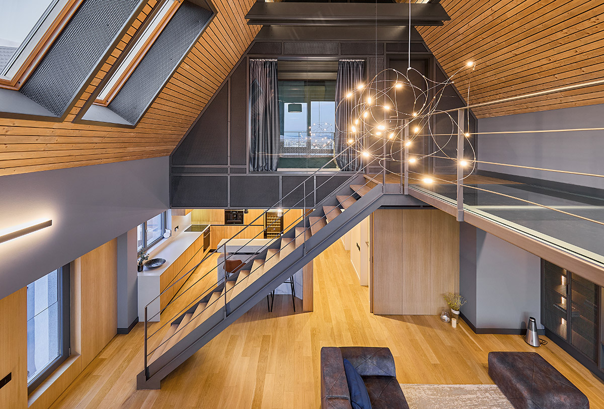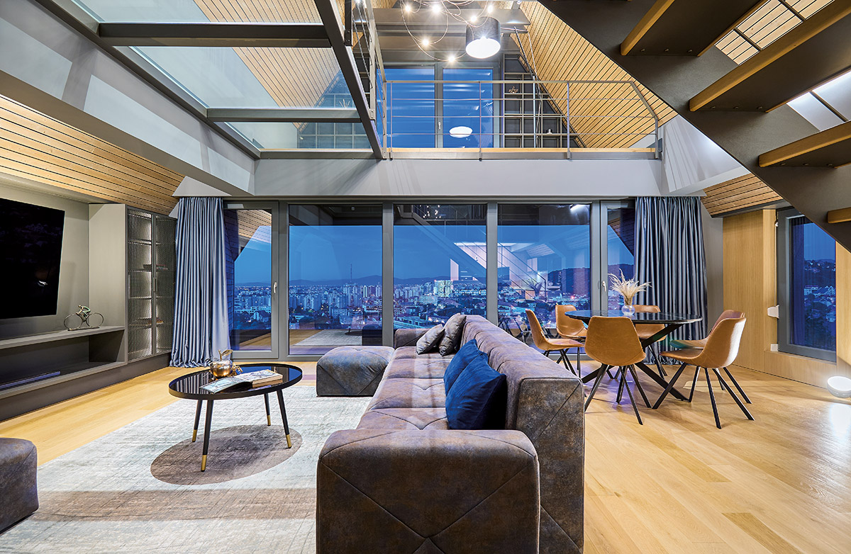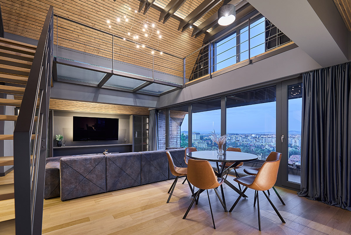 Încă de la primul nivel se remarcă deja fuziunea unor elemente de design din zona industrială, cu cele calde, de esență lemnoasă, specifice cabanelor montane. Aici, își dau întâlnire, firesc, zona de zi și cea de dining – de unde orașul poate fi privit pe îndelete prin ferestrele generoase. Spațiul bucătăriei se organizează calm în jurul unei mese-bar monolit, iar finisajele, textilele și mobilierul ales populează discret și esențial diversele arii.