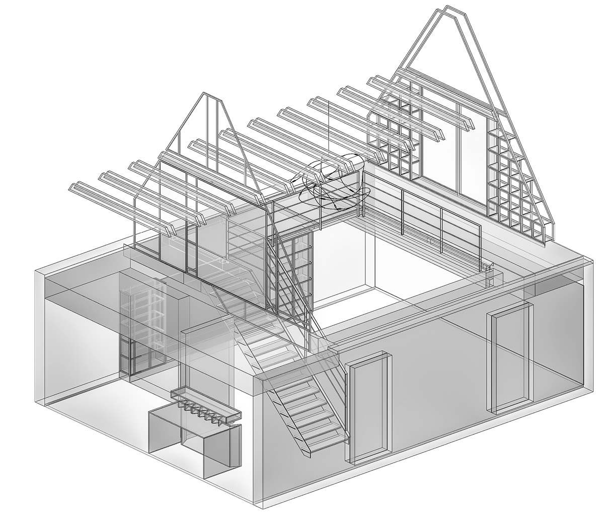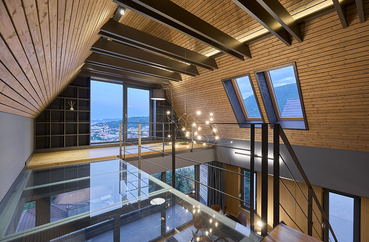 Elementul de legătură pe verticală dintre cele două niveluri, scara, are o prezență minimalistă, conducând către zona intimă a casei. Aici, zona de noapte este conectată cu o mică bibliotecă ce privește către vale printr-o pasarelă transparentă care permite inclusiv un dialog permanent cu zona de zi. Deschis către living este și dormitorul grație unui perete parțial vitrat care îi permite acestuia și o legătură vizuală cu natura și orașul.