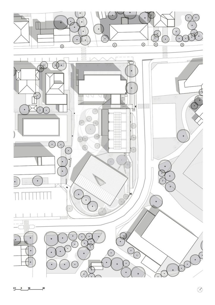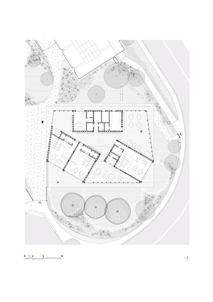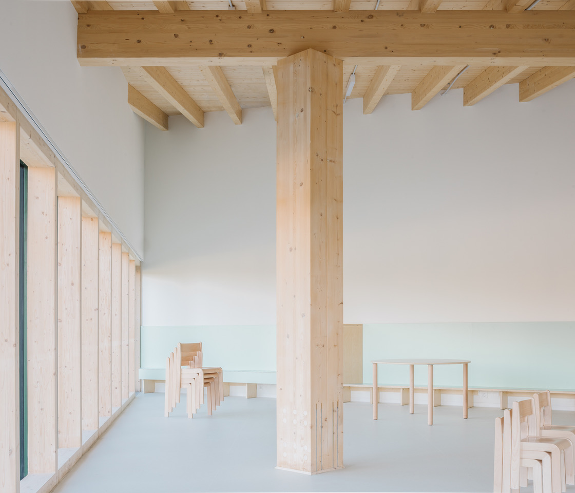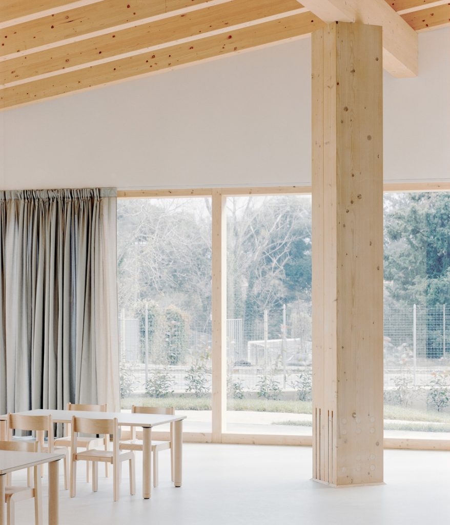 Grație fațadelor transparente, care dezvăluie celor aflați afară ritmul regulat al stâlpilor de susținere din lemn, impresia generală este una de sistem permeabil, în care grădina exterioară este integrată în mod natural. Înăuntru, articulările dintre spații sunt lizibile în zonele tranziționale, unde trecerea fluidă dintre diferitele medii este clar subliniată de elemente precum un portal, un luminator ce aduce soarele într-un spațiu pe dublă înălțime sau o coloană solitară. Acestea devin puncte focale care invită la explorare și descoperire, prin modul de amplasare și prin dimensiunile lor.