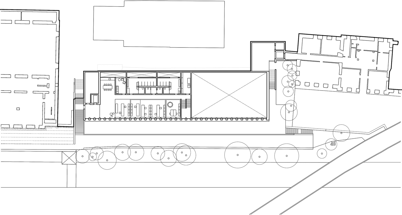 Proiectul a urmărit reactivarea promenadei de-a lungul râului, transformând și redefinind condițiile anterioare. Astfel, clădirea este definită ca un volum simplu și etajat, inclus în panta albiei râului și care devine, prin aceste abordări arhitecturale, abia vizibil din exterior. Acest tratament volumetric conturează un element care permite generarea unui nou spațiu public la nivelul acoperișului și care leagă traseele pietonale existente cu noi circuite la diferite niveluri, oferind o promenadă dinamică de-a lungul malului râului. Transformarea se adresează cu sensibilitate ansamblului de clădiri protejate din zonă. Proiectul propune o integrare subtilă a arhitecturii noi în contextul existent, oferind o relaționare inedită ale celor două ipostaze.