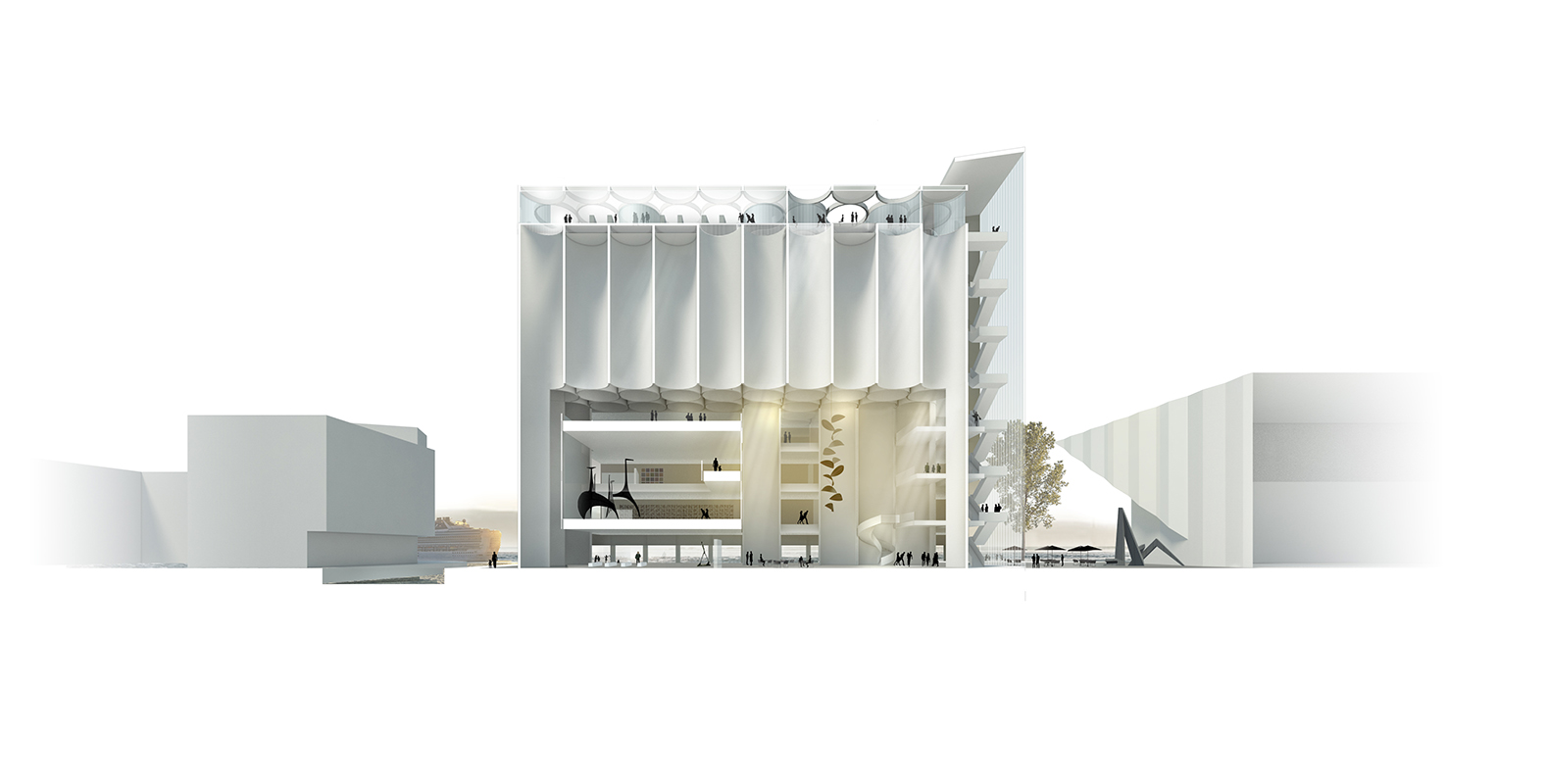 Clădirea include și zone de conservare, birouri și – în scopul atragerii publicului mai tânăr – o „școală culturală” pentru copii și o galerie digitală. Punctele de observație prevăzute pe două niveluri deschid perspective asupra portului, iar pe acoperiș a fost amenajat un bar înconjurat de terase mărginite de cilindri de sticlă, care se armonizează cu exteriorul unduitor al silozurilor, fiind percepute ca o continuare a acestora. Văzut de la distanță, muzeul apare ca un far, într-un gest de respect față de istoria locului.