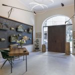Boiseria de nuc din recepţie unifică vizual cele două uşi ale chicinetei şi depozitării cu biblioteca din partea centrală. Ramele de mari dimensiuni, care devin elementul central al amenajării, încadrează nişe şi tablouri în care sunt expuse piese recuperate din vechile sobe de teracotă ale clădirilor istorice. În stânga şi în dreapta uşii de intrare din stejar înconjurate de un plan continuu de sticlă, se află două coloane de piatră valoroase, de asemenea recuperate din clădiri demolate.