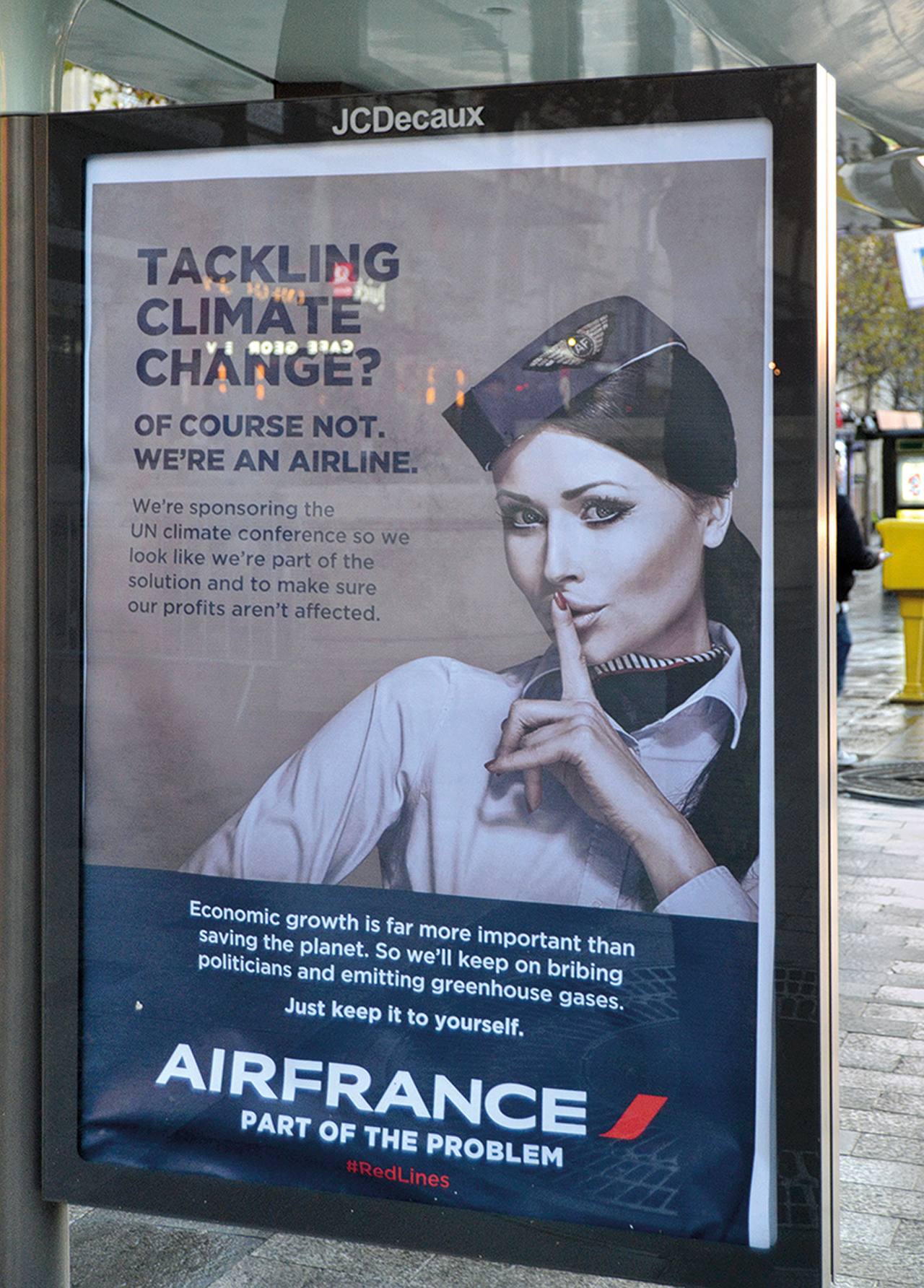Intervenția a vizat sistemele de expunere aparținând companiei JC Decaux, una dintre cele mai mari deținătoare de spații publicitare din domeniul public și, în același timp, sponsor oficial al conferinței COP 21. Mesajul căuta să scoată în evidență legătura dintre publicitate, consumerism, dependența de combustibili fosili și schimbarea climei.