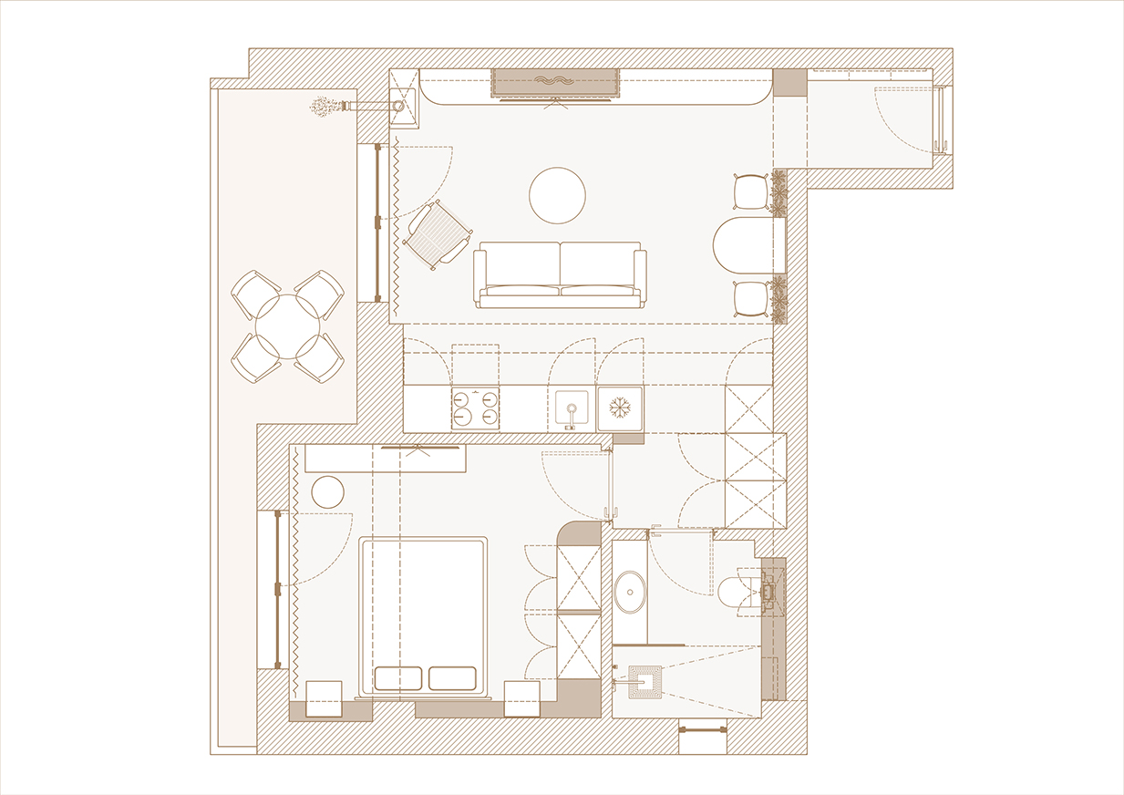 Din punct de vedere funcțional, amenajarea a presupus o reorganizare spațială, pentru a profita din plin de suprafața redusă, permițând totodată separarea funcțiunilor locuinței. Astfel, depozitările au fost concentrate în zona de zi și finisate în aceleași tonuri folosite și în cazul pereților, pentru a crea impresia unui spațiu mai generos și, mai ales, pentru a păstra caracterul fluid al ansamblului.