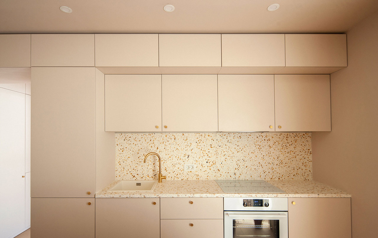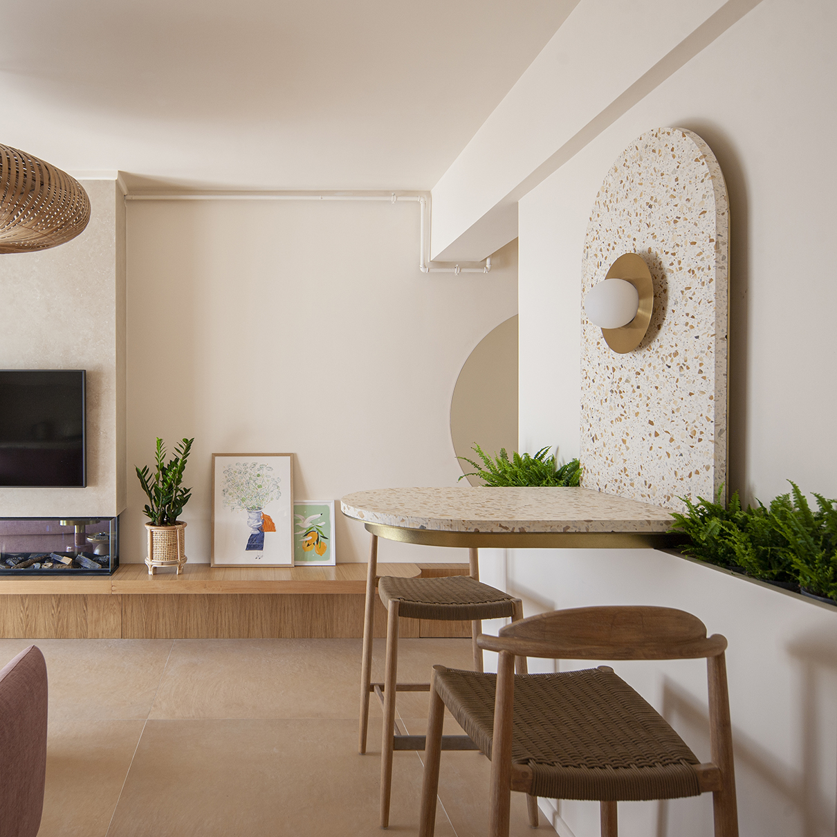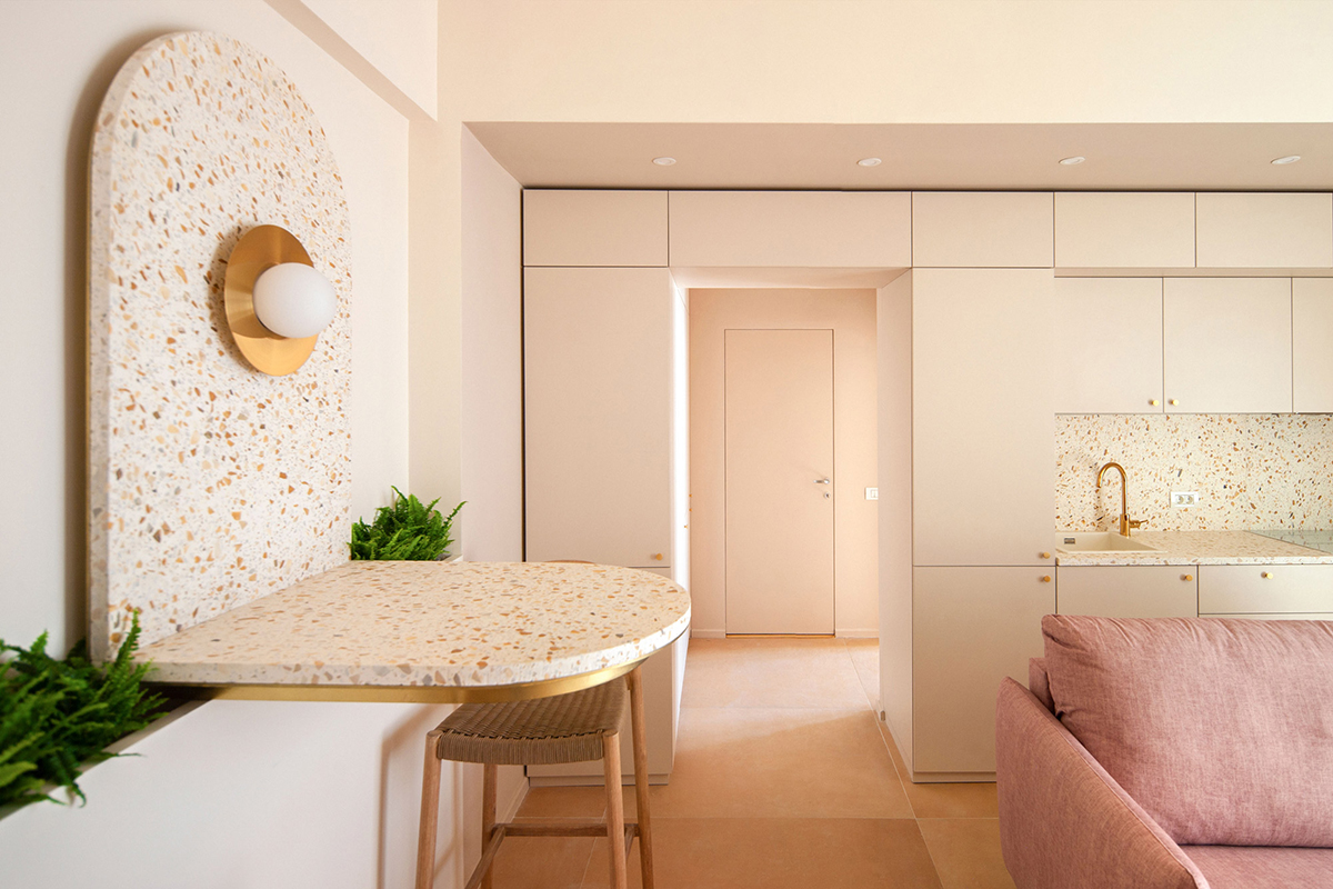 În întregul apartament, tonurile pământii, deschise ale podelelor amintesc de nisipul unei plaje, iar piesele de mobilier personalizate, cu design minimalist, sunt realizate din materiale care subliniază, la rândul lor, legătura cu natura. Lemnului i se alătură rattan-ul, material specific zonei de litoral, iar inserțiile din terrazzo – în cadrul backdrop-ului sau al blatului de dining, care se continuă vertical pe perete – aduc o notă de prețiozitate. Precum în interiorul unei case tradiționale, „inima” living-ului este spațiul din jurul focului, reinterpretat într-o linie minimalistă. Zona de zi este completată printr-o terasă de unde marea poate fi admirată în orice moment al zilei.