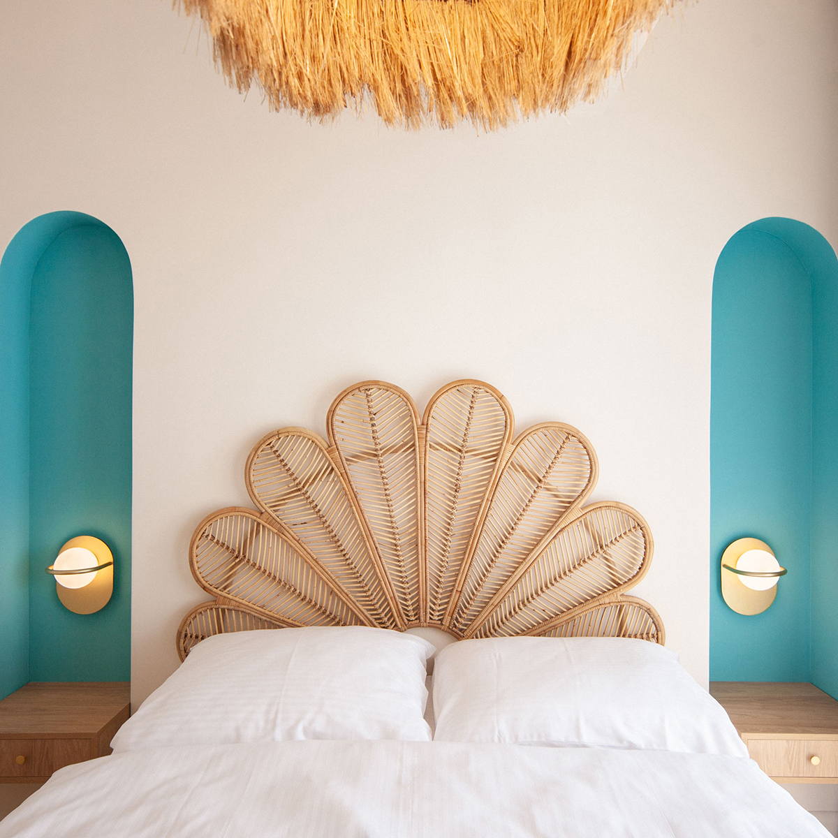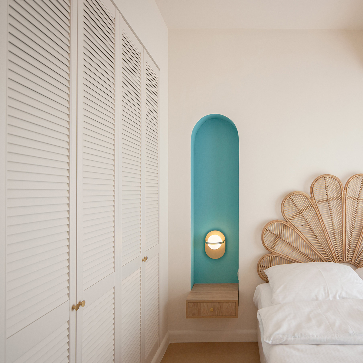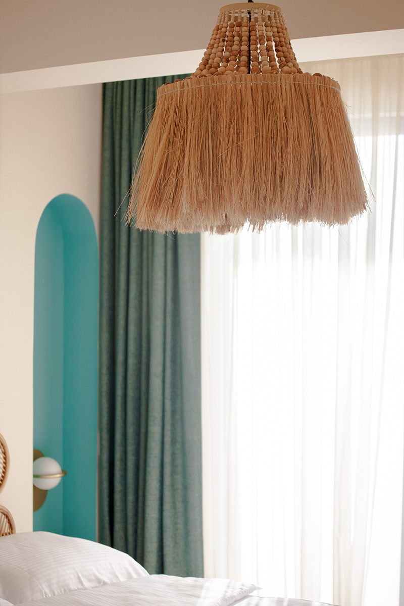 În dormitor, inspirat de interioarele bungalow-urilor, piesa principală este căpătâiul patului, în formă de evantai, realizat din rattan, completat perfect de abajurul corpului de iluminat suspendat, din mărgele și păr de cal. Aici, depozitarea este rezolvată prin dressing-ul încastrat, cu uși din lemn lamelar, în timp ce noptierele și masa de vanity sunt suspendate, pentru a maximiza suprafața redusă disponibilă. Nișele din perete sunt vopsite în albastru deschis, culoare specifică arhitecturii vernaculare din zonă.