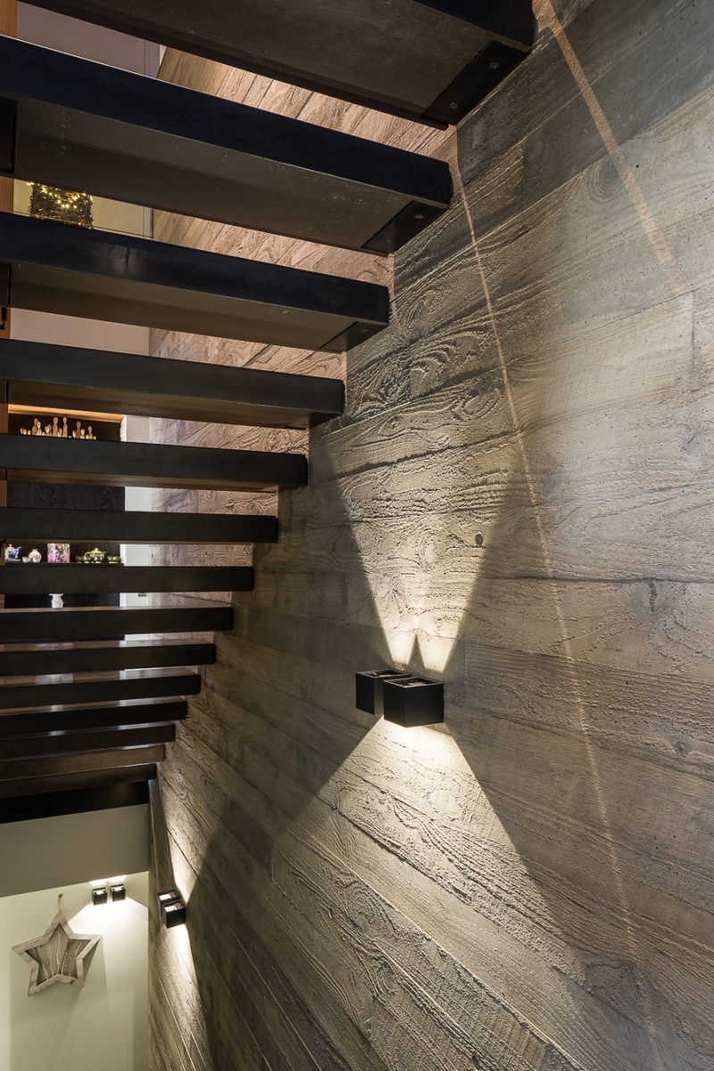 Betonul a fost lăsat nefinisat, în stare brută, expunând în totalitate variaţiunile de textură şi culoare inerente compoziţiei sale, dar şi metodologia construcţiei. Pereţii interiori au, la rândul lor, un aspect natural, fiind finisaţi doar cu vopsea mată, în timp ce podelele sunt de culoarea cărbunelui şi acoperite de un strat lucios. Peretele din spatele zonei de living constă într-un panou din lemn de stejar natur, în timp ce plafoanele şi pereţii laterali sunt placaţi cu scânduri de cedru în nuanţe asemănătoare.